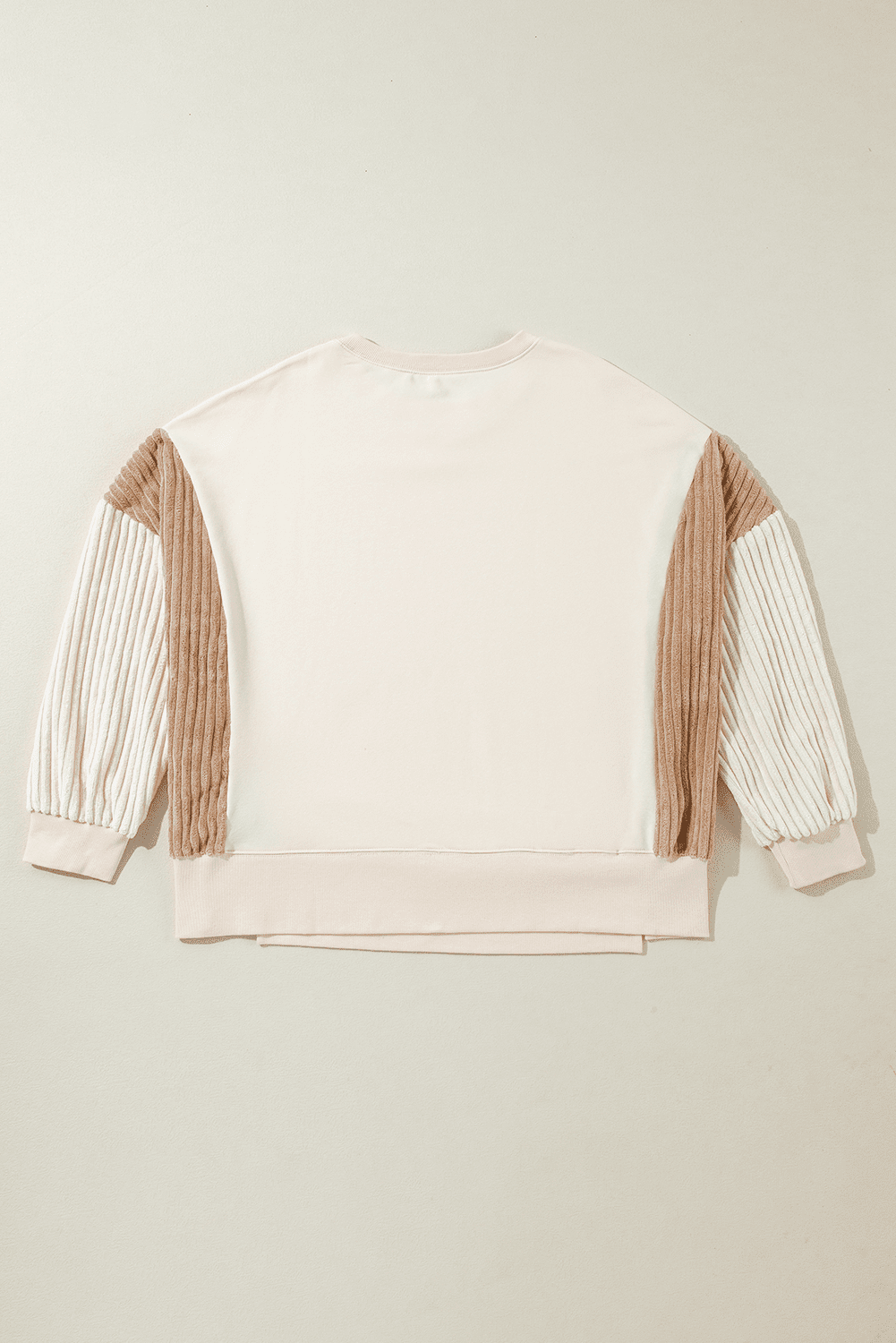 Stylish corduroy patchwork sleeves for a trendy and textured look.