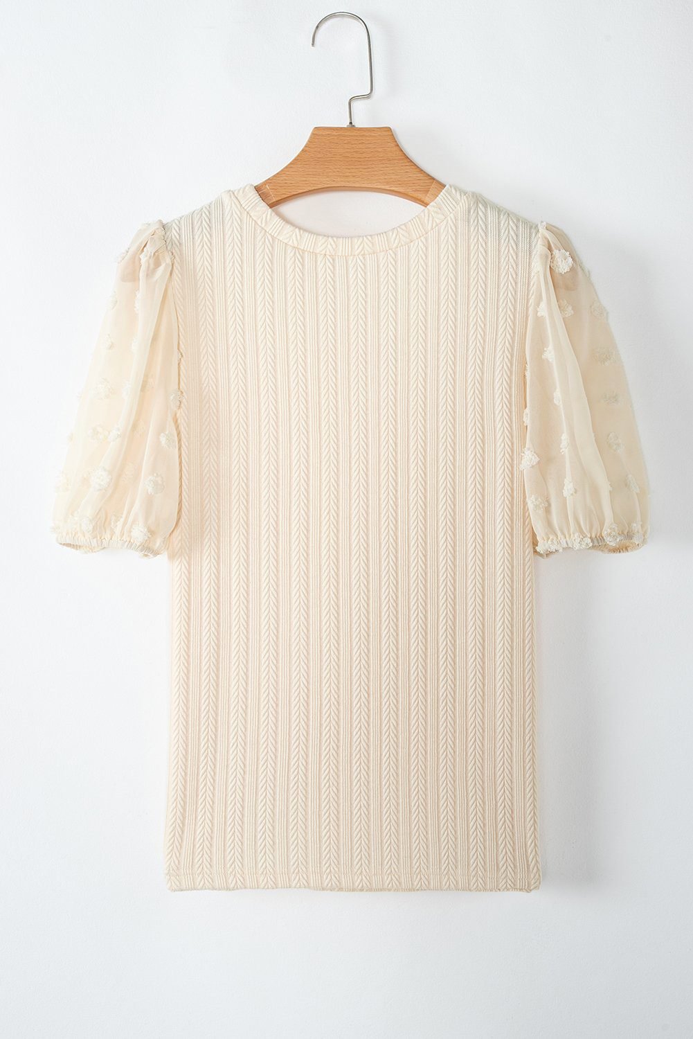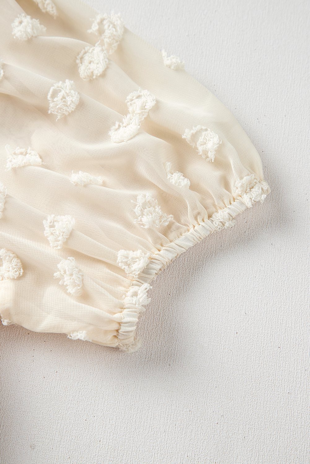- Feminine swiss dot mesh puff sleeve adds a touch of elegance.