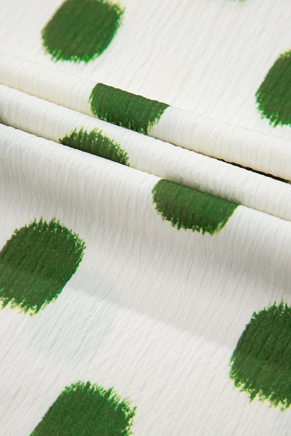 Ruffles on shoulder, shirred yoke and balloon sleeve.