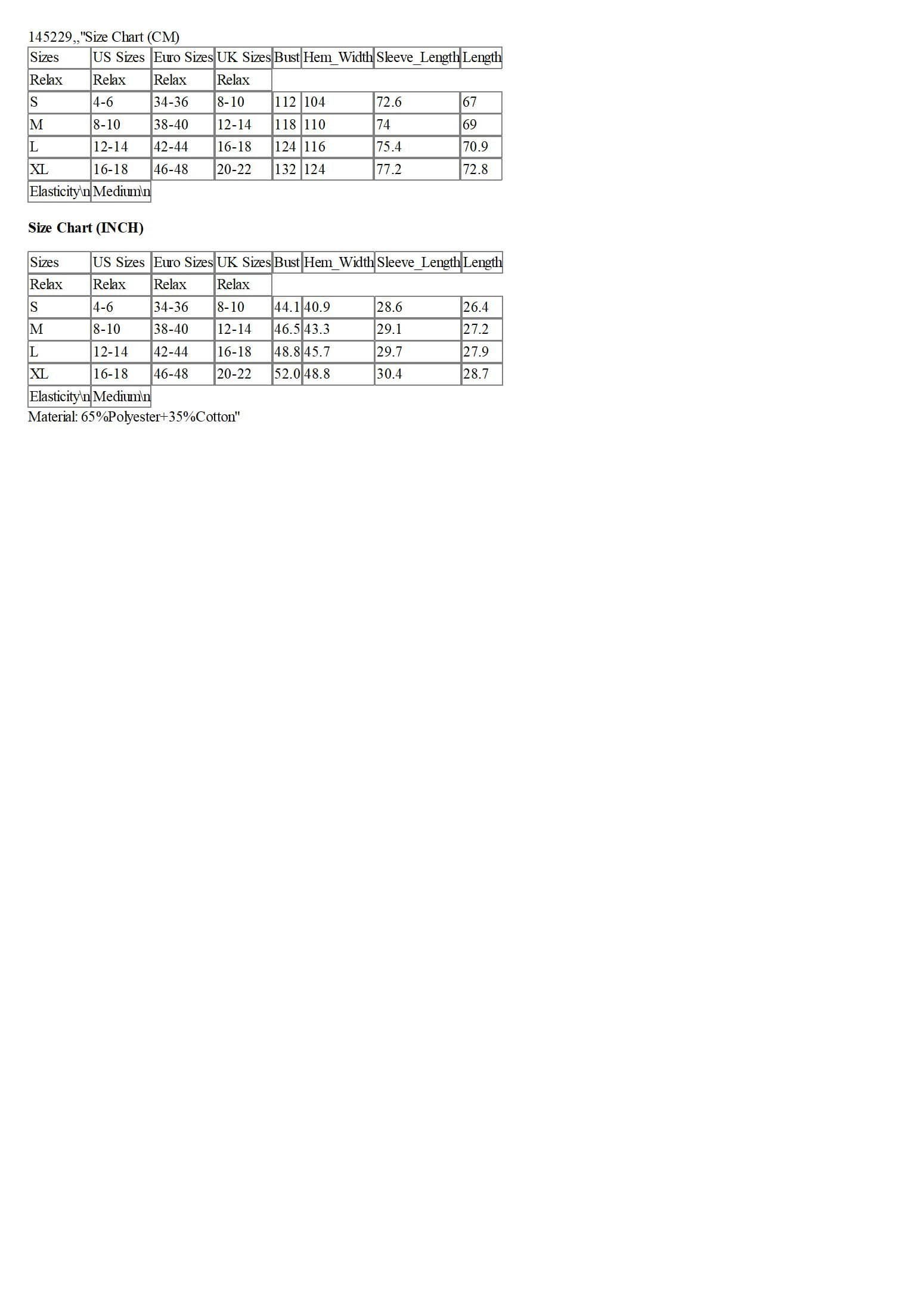 Sizes | US Sizes | Euro Sizes | UK Sizes | Bust | Hem_Width | Sleeve_Length | Length |