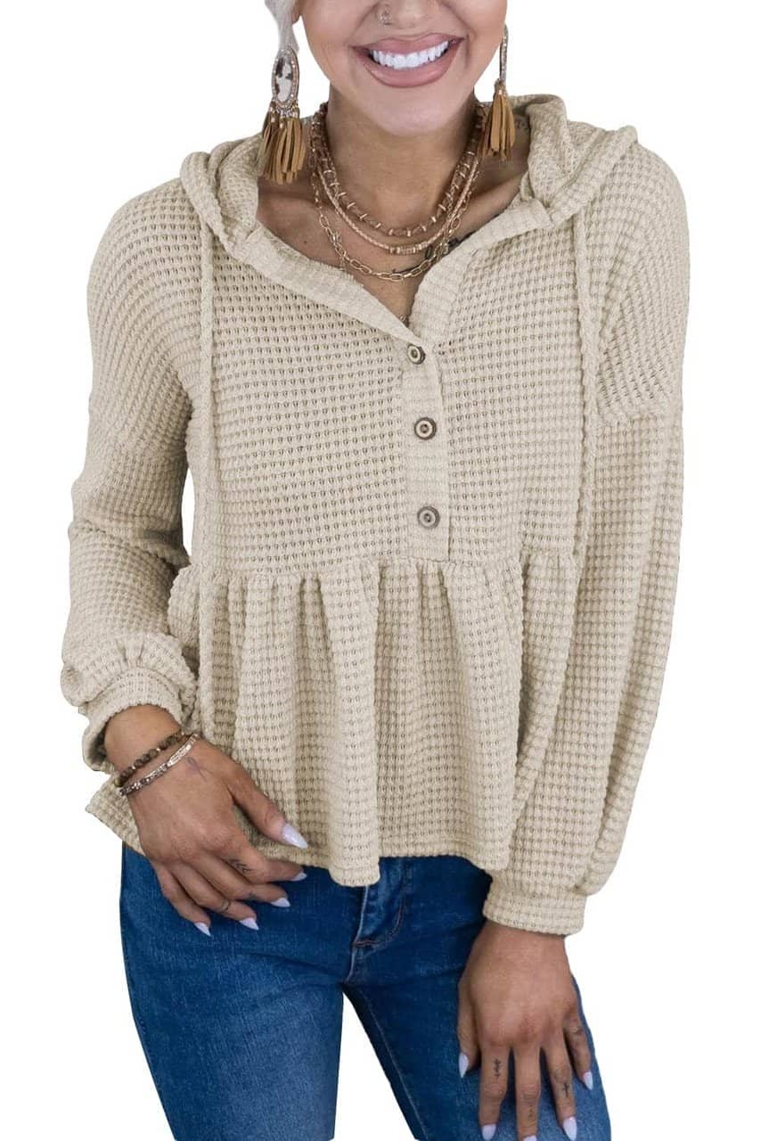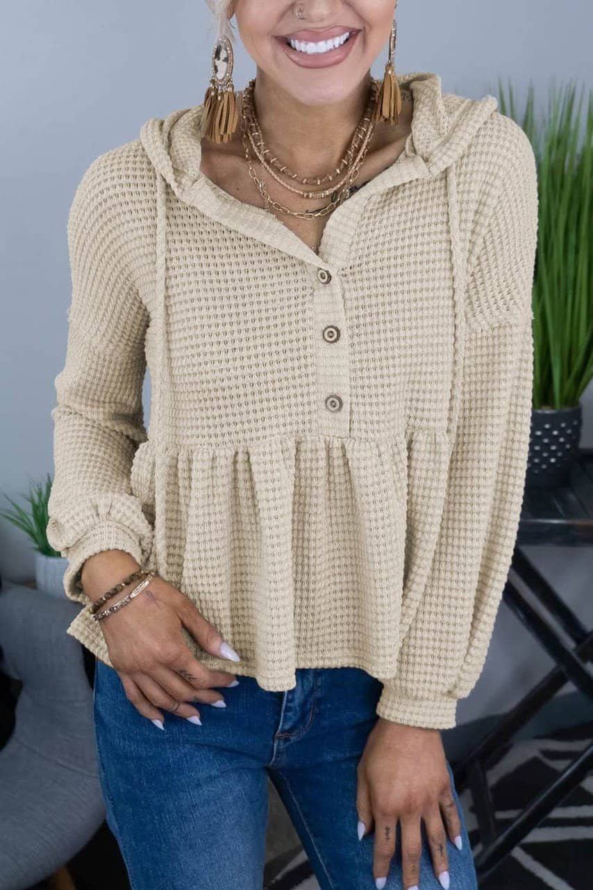 - This hooded top is fashionable for its lightweight waffle knit material