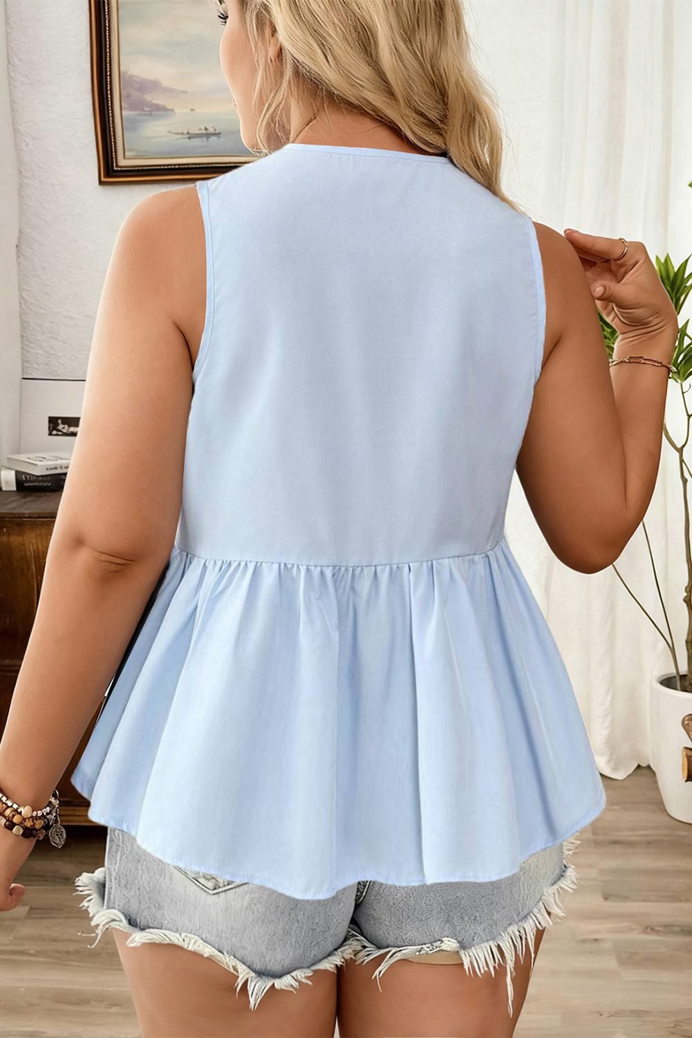 Be the first to review “Beau Blue Plus Size Solid Color Bow Tie Peplum Tank Top”