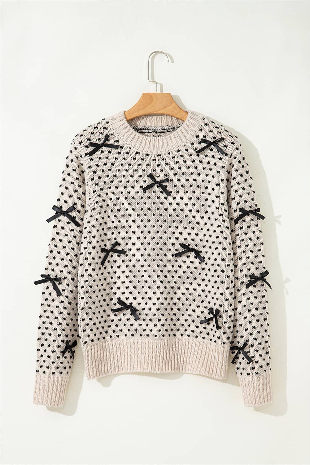 Beige Bow Decor Color Contrast Ribbed Edge Crew Neck Sweater