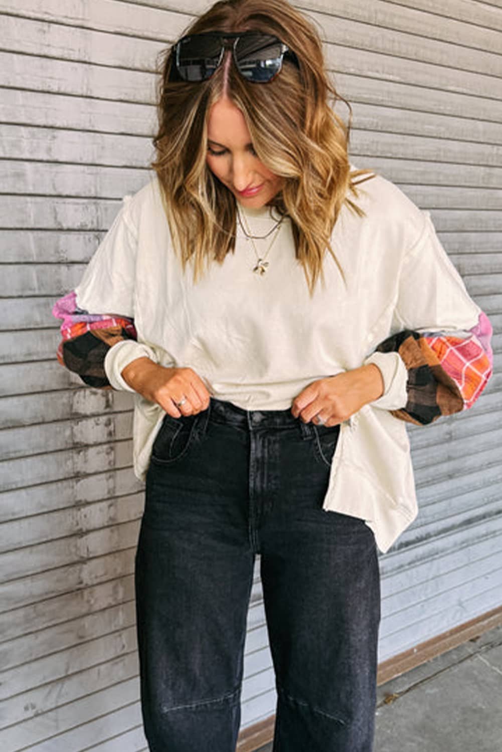 It features contrast plaid sleeve and exposed seam detail.