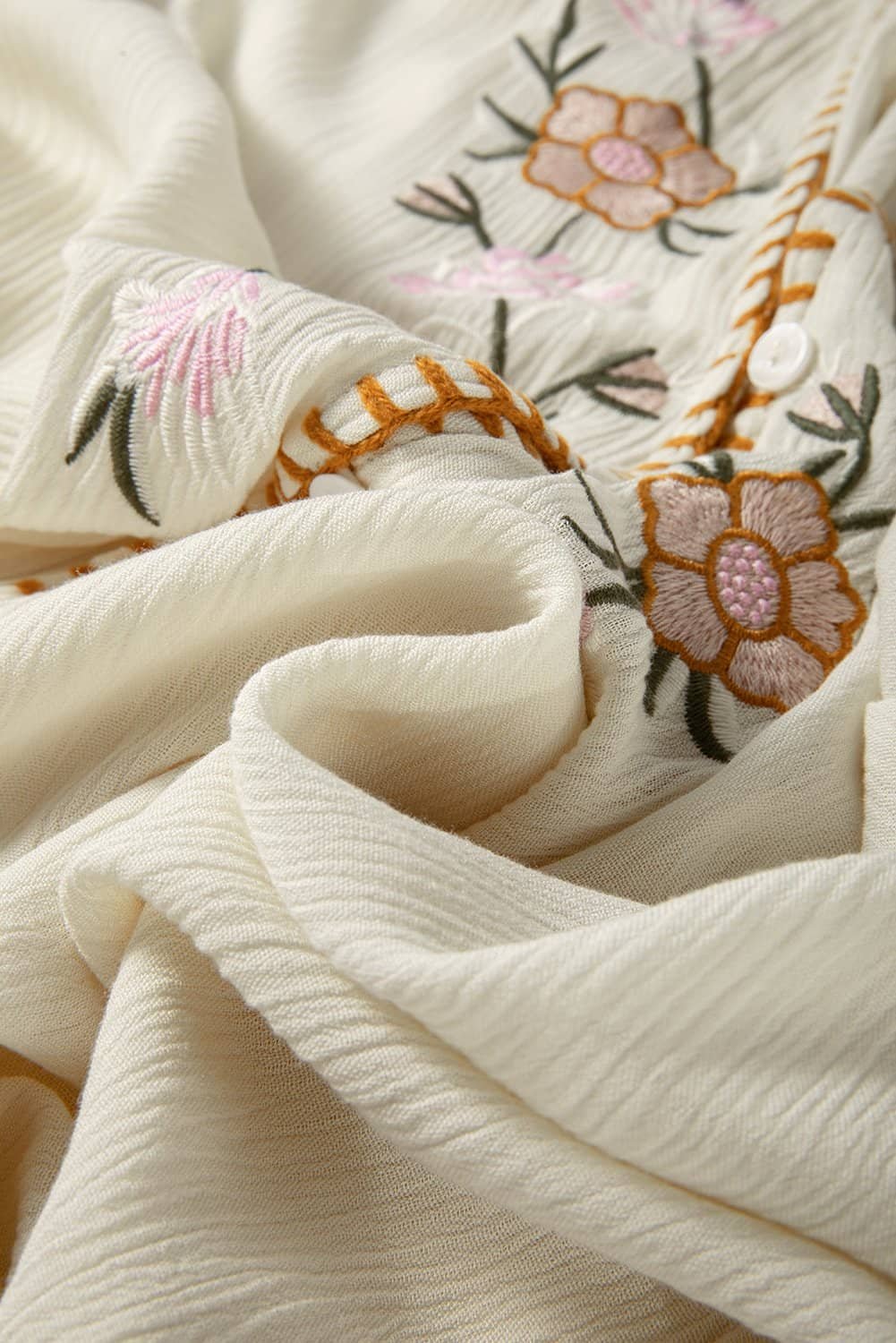 Beige Floral Embroidered Textured Puff Sleeve Loose Shirt