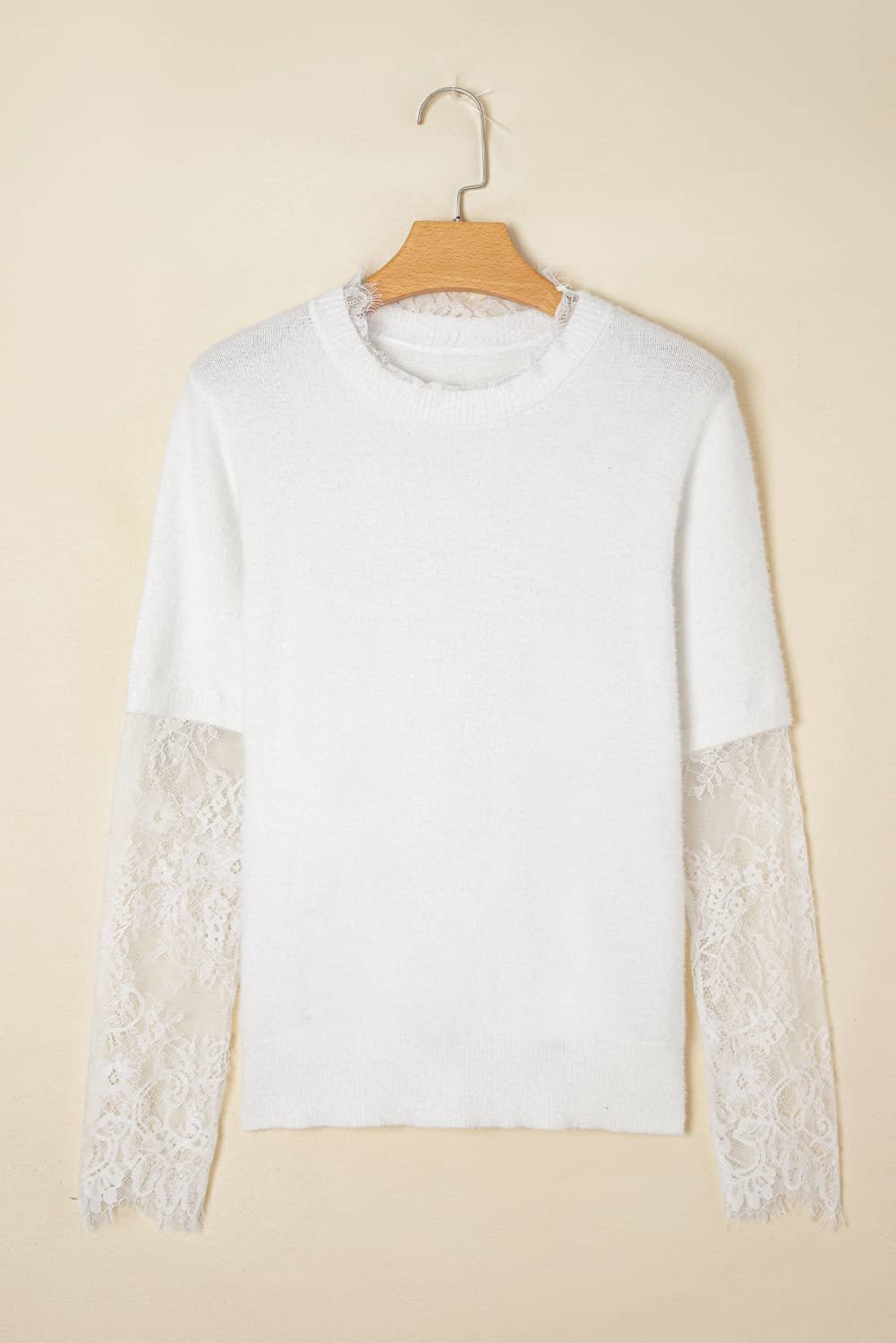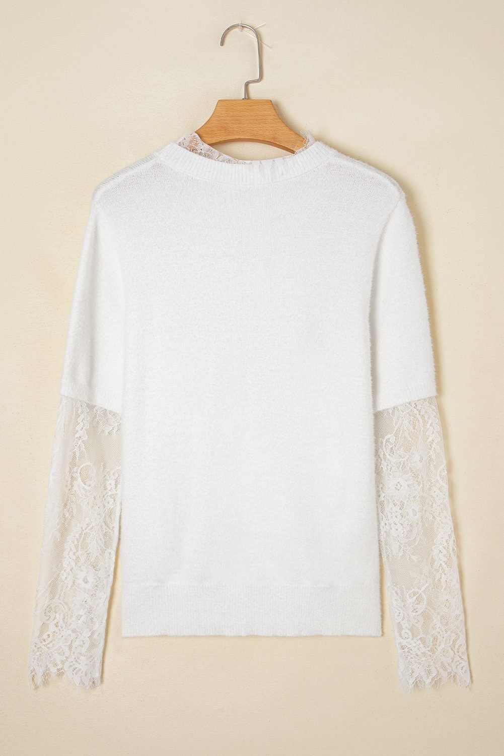 Be the first to review “Beige Lace Sleeve Patchwork Faux Two-Piece Fuzzy Sweater”