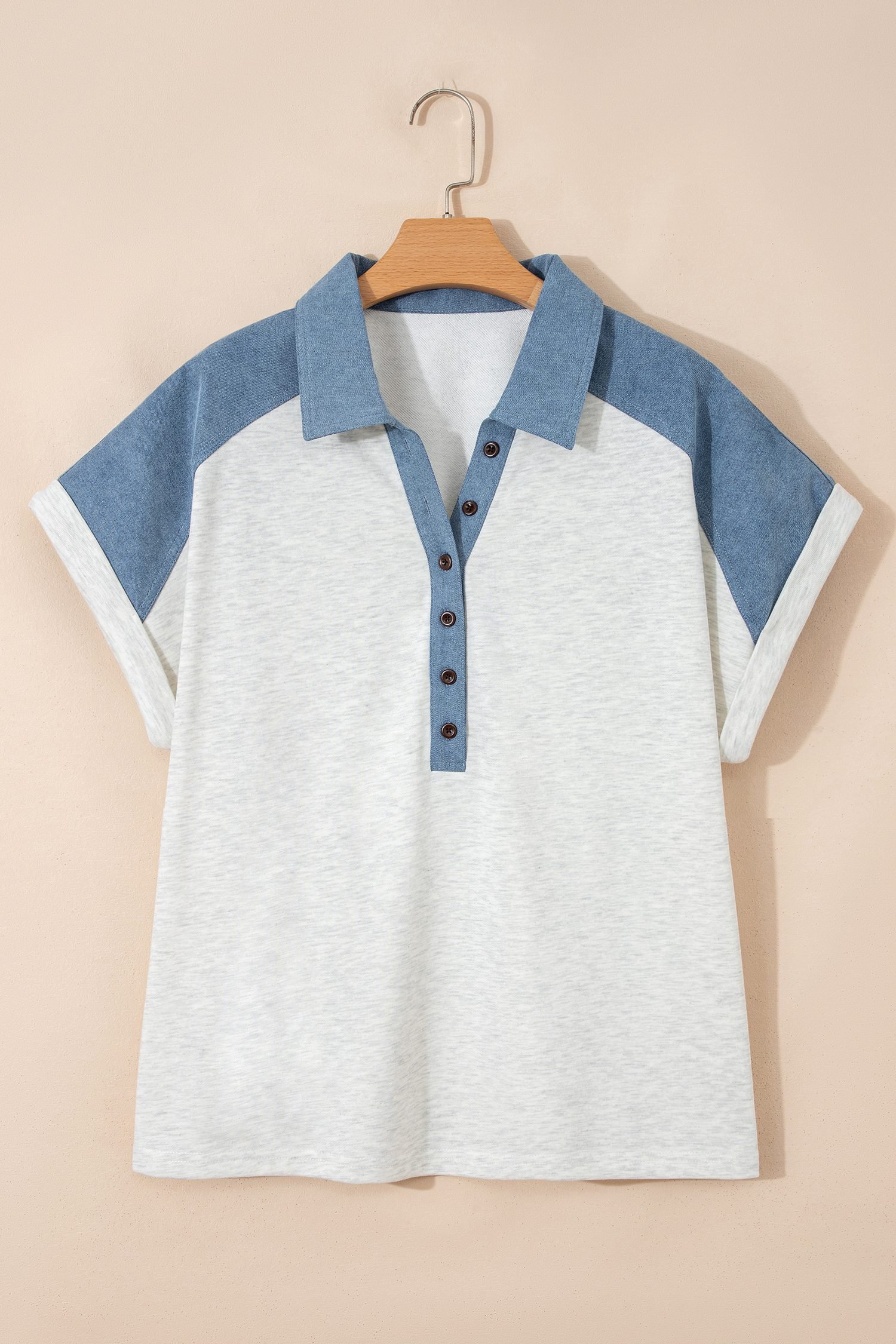 It features a collared design with half buttons for flexible button up/down.