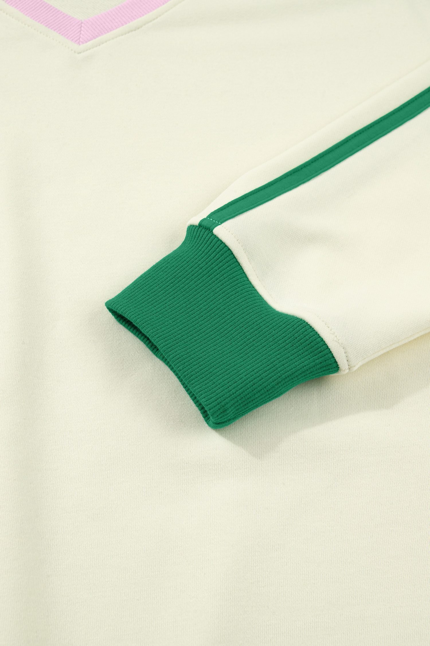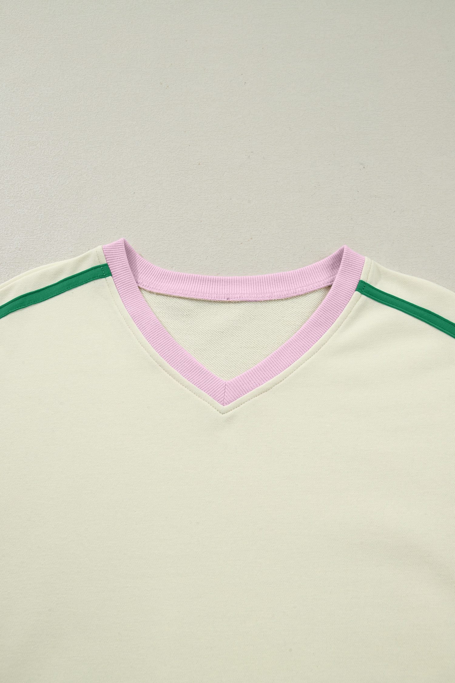 It includes a v neck sweatshirt and elastic waist mini skort.