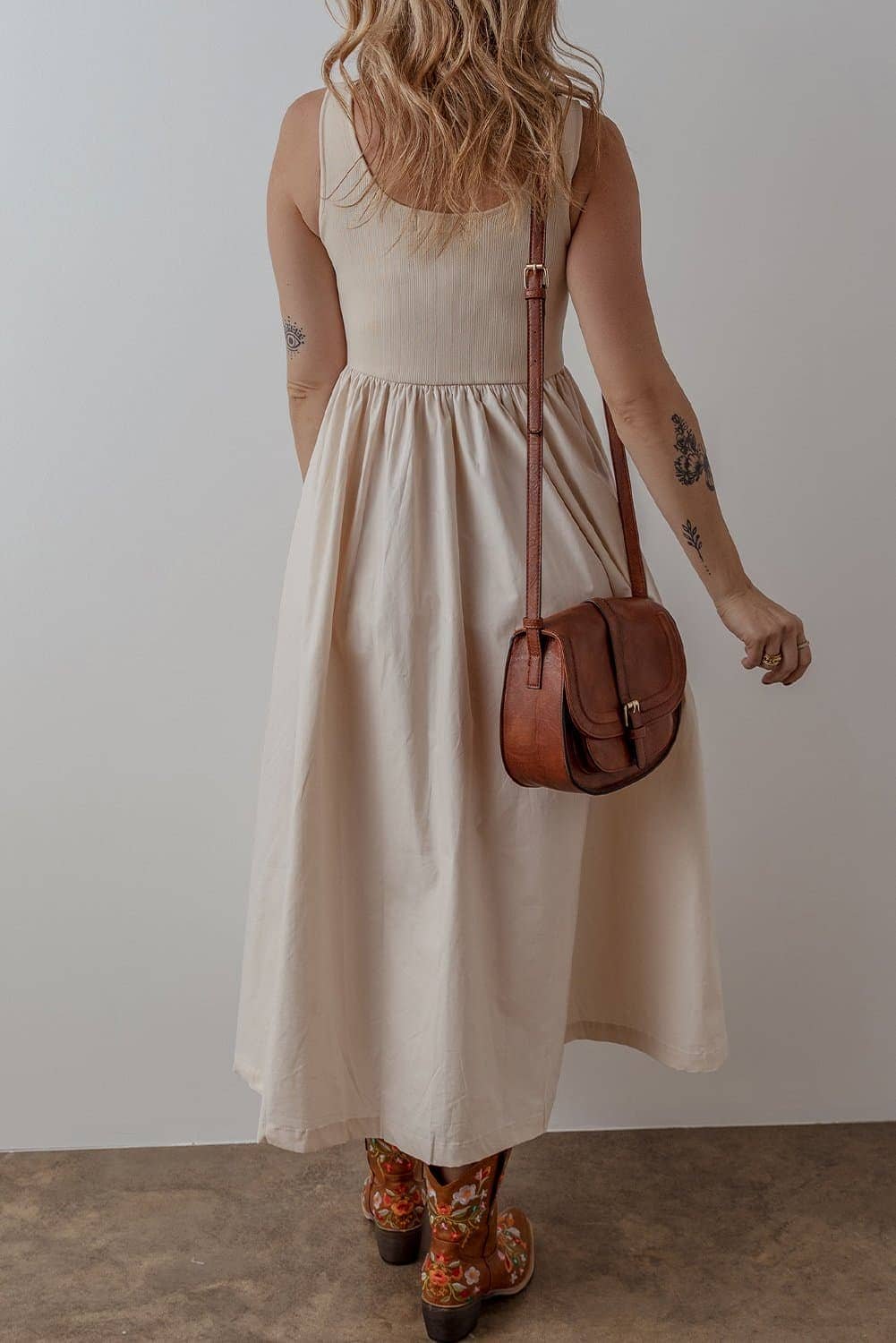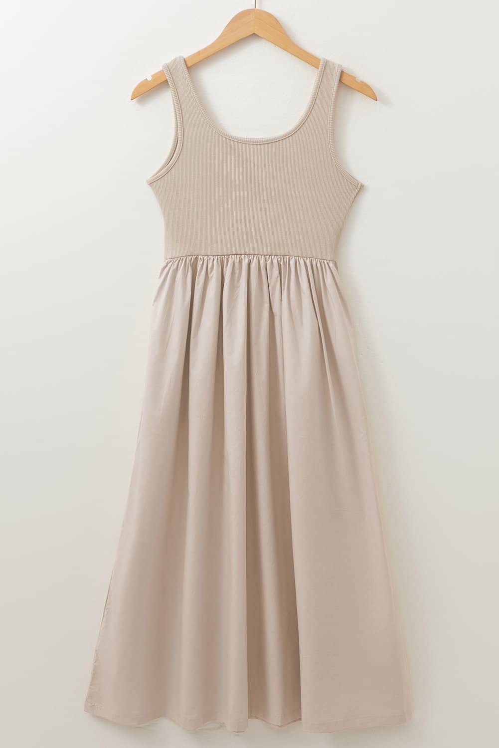 Beige Scoop Neck Ribbed Bodice Pleated Sleeveless Long Dress