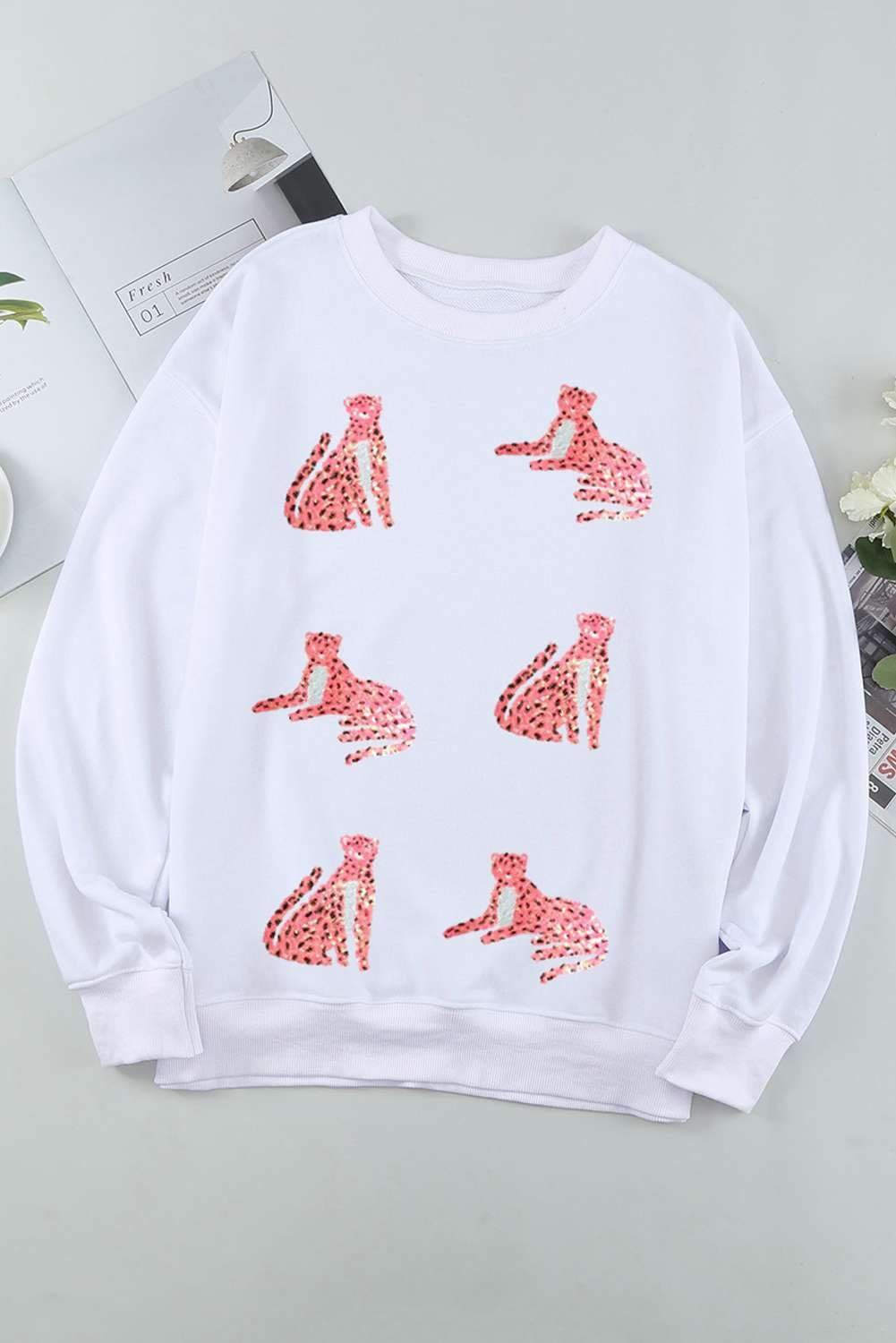 Beige Sequin Cheetah O Neck Drop Shoulder Sweatshirt