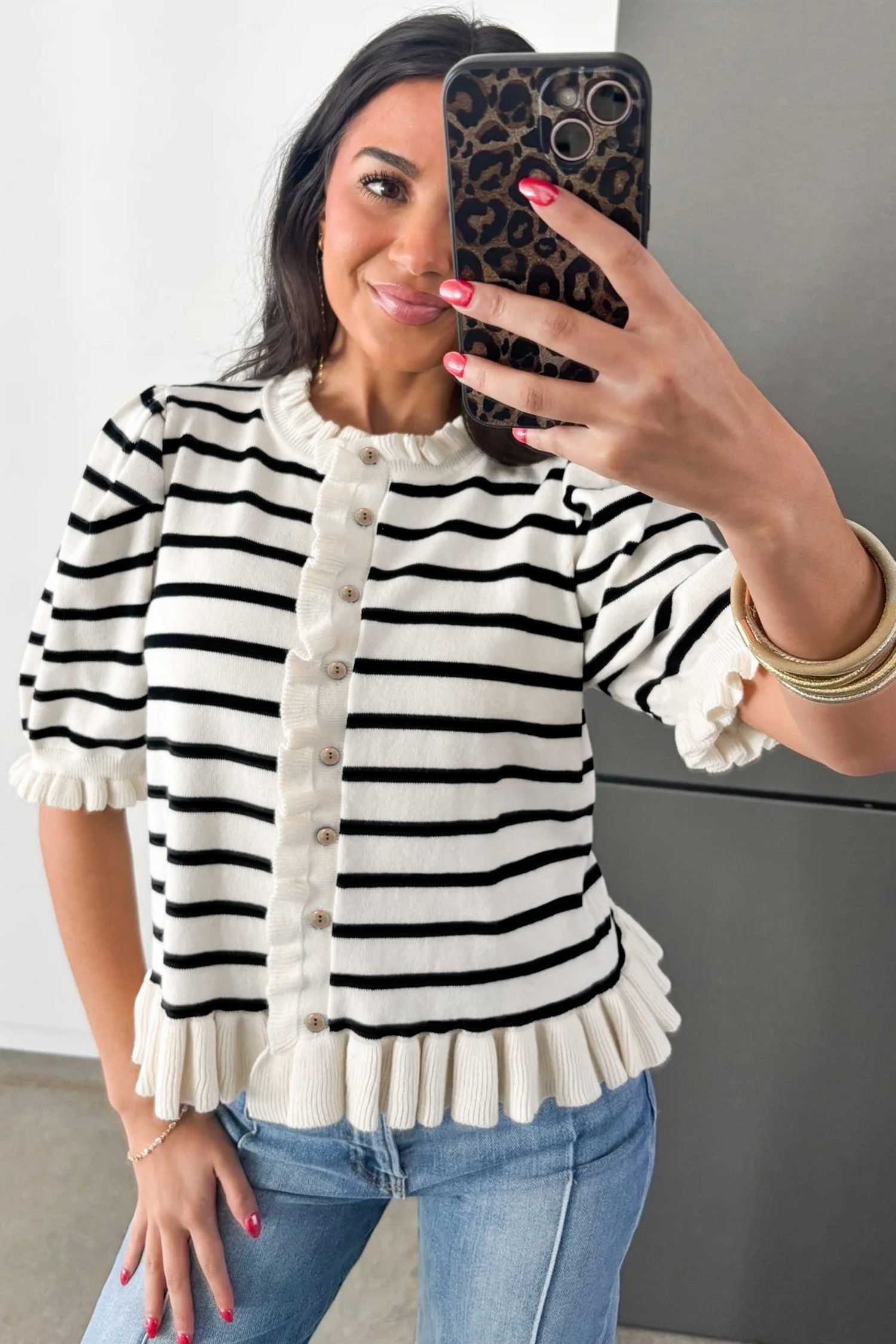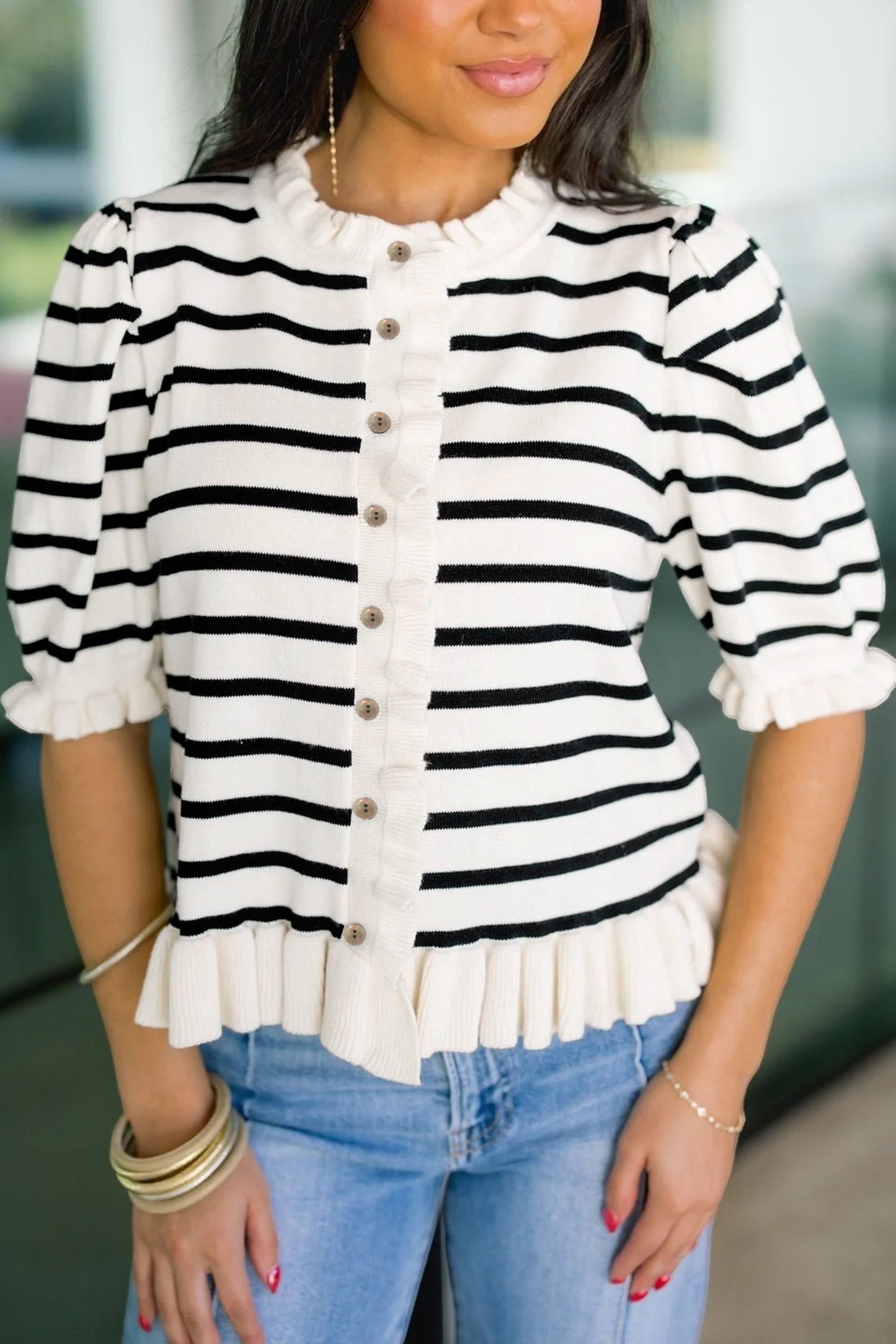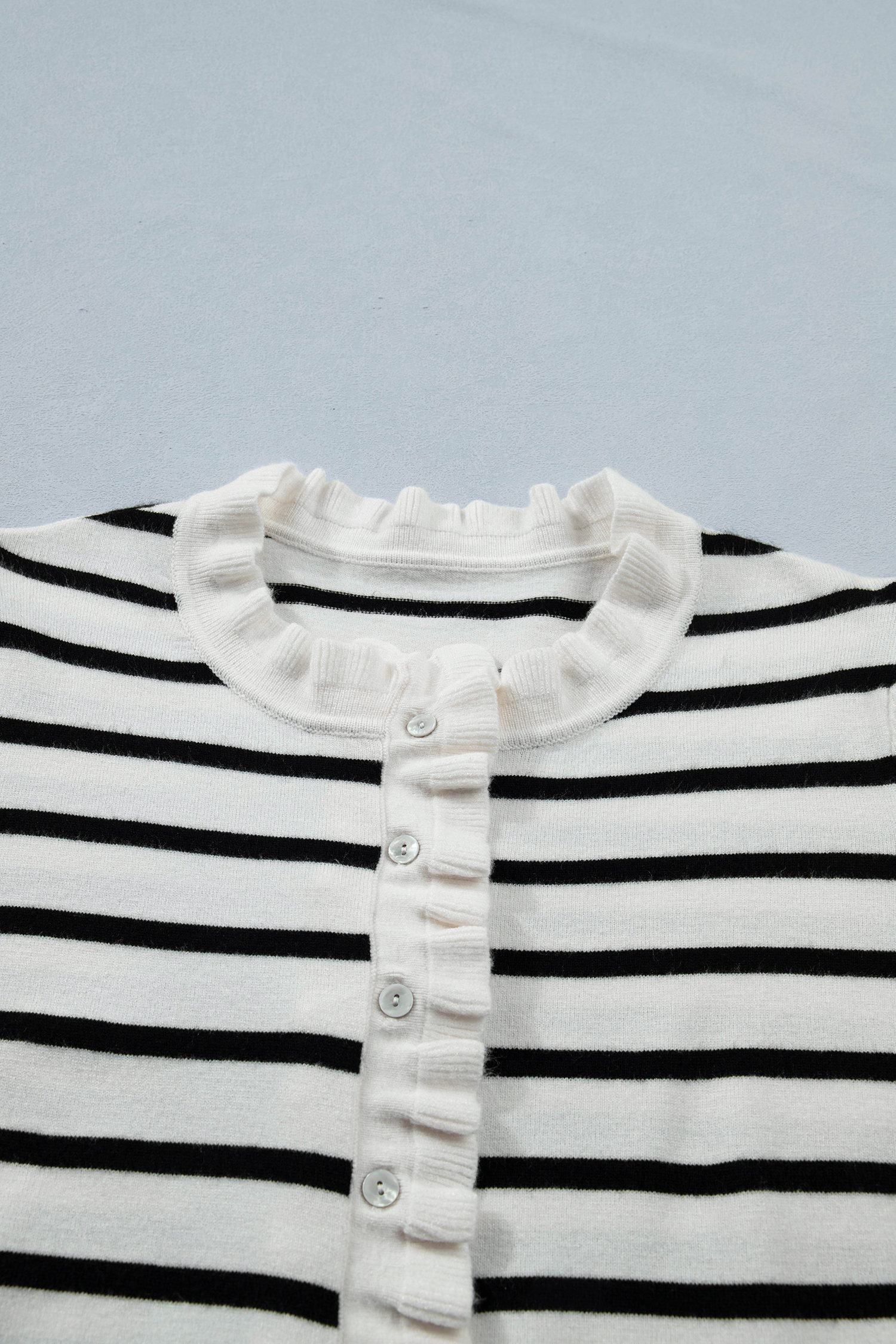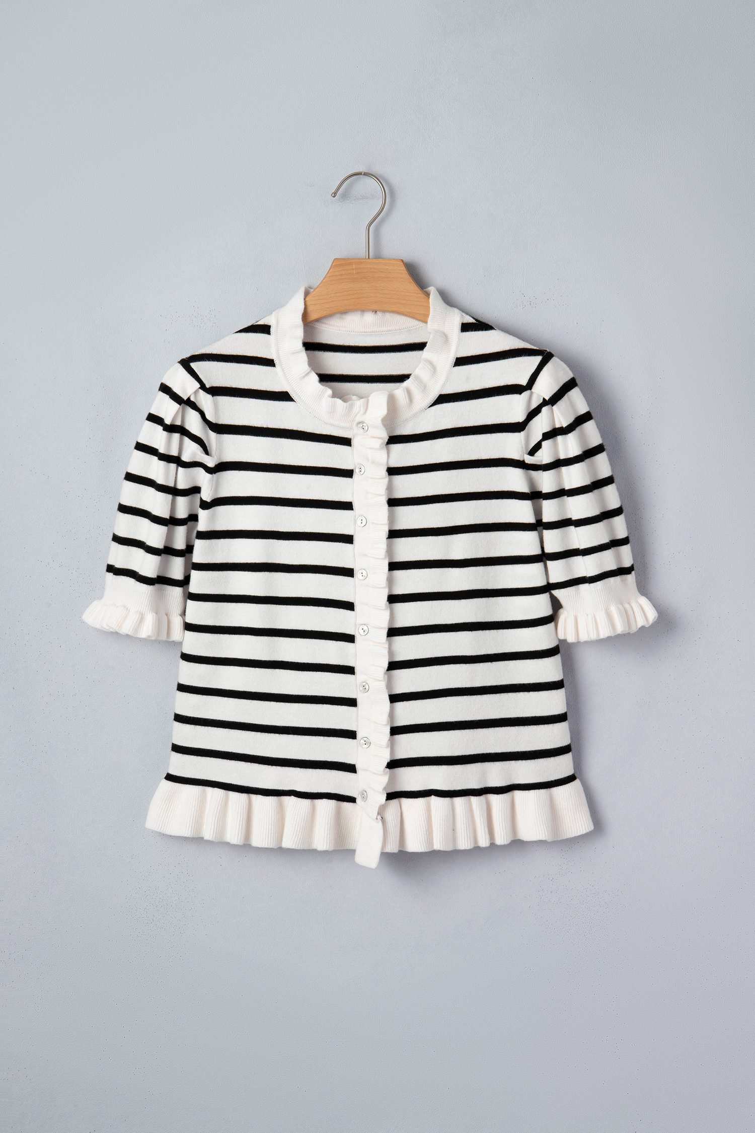 Beige Stripe Ruffle Trim Button Down Knit Short Sleeve Sweater Cardigan