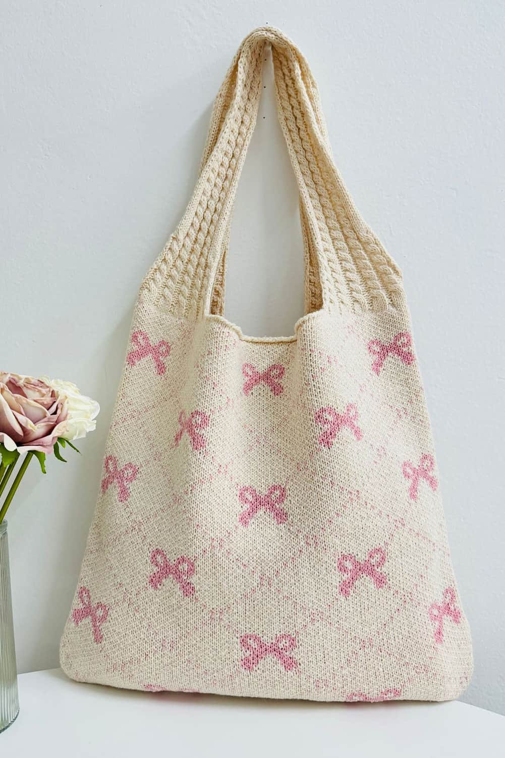 Beige Sweet Bowknot Textured Strap Knit Shoulder Bag