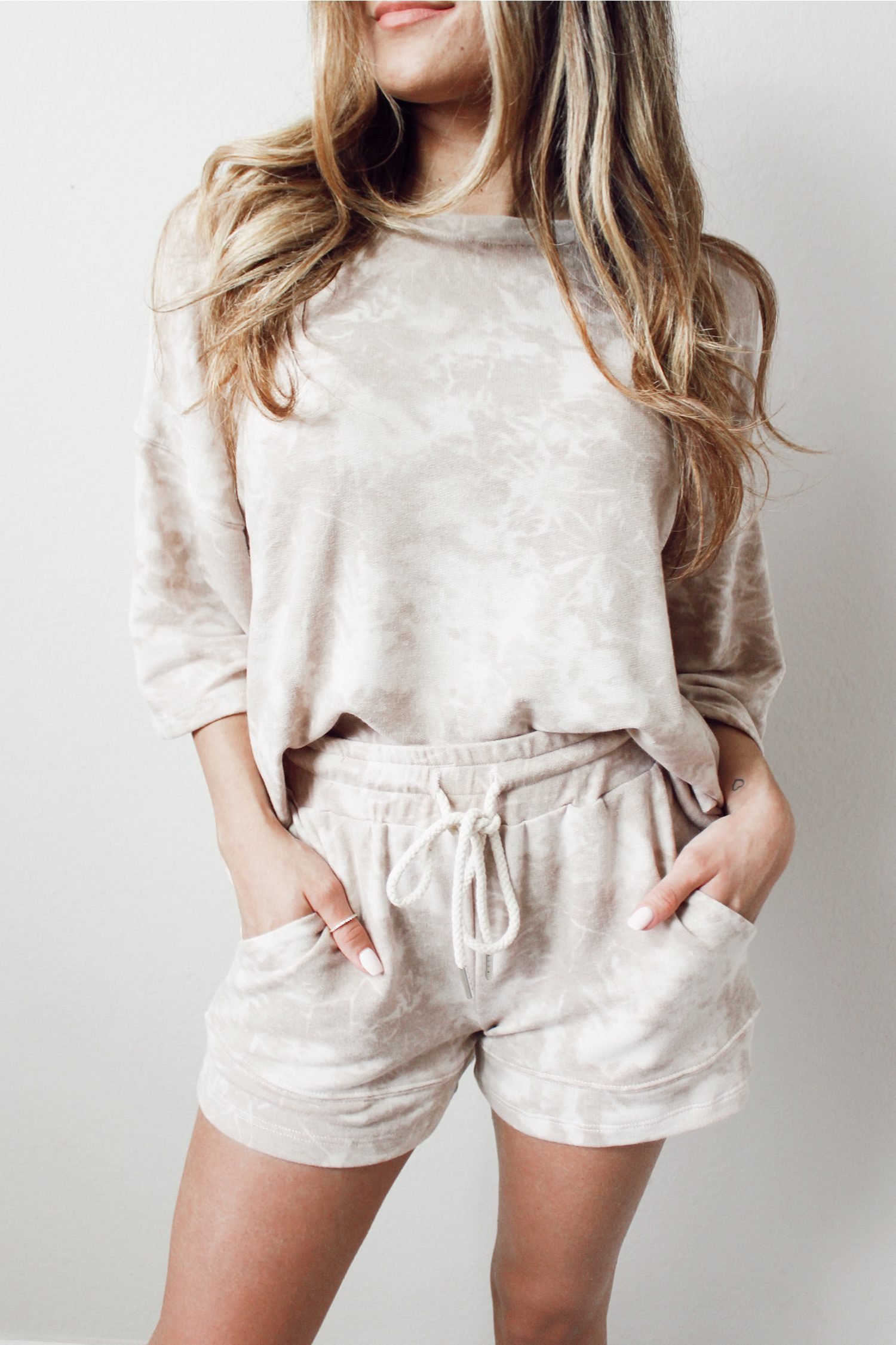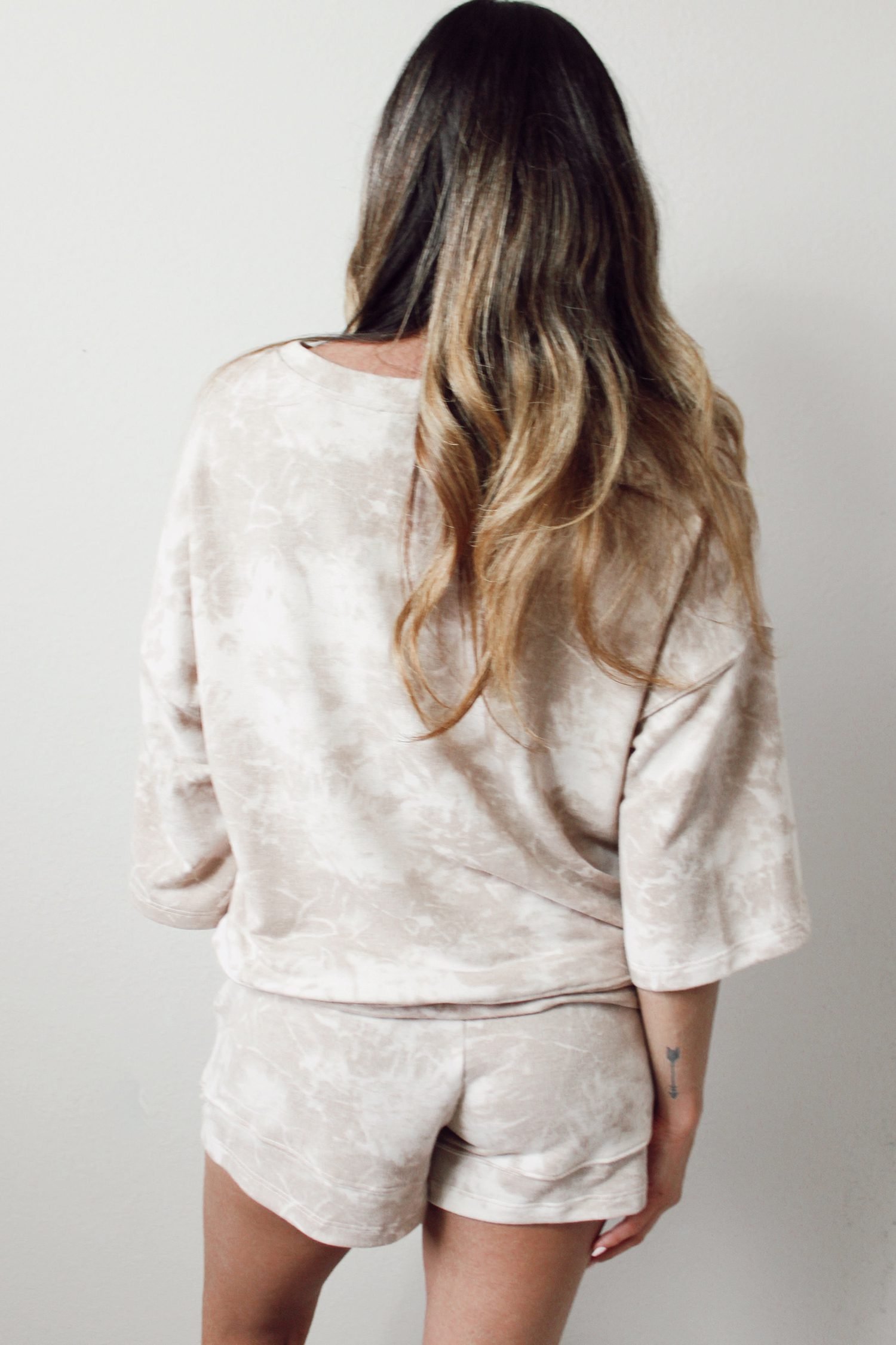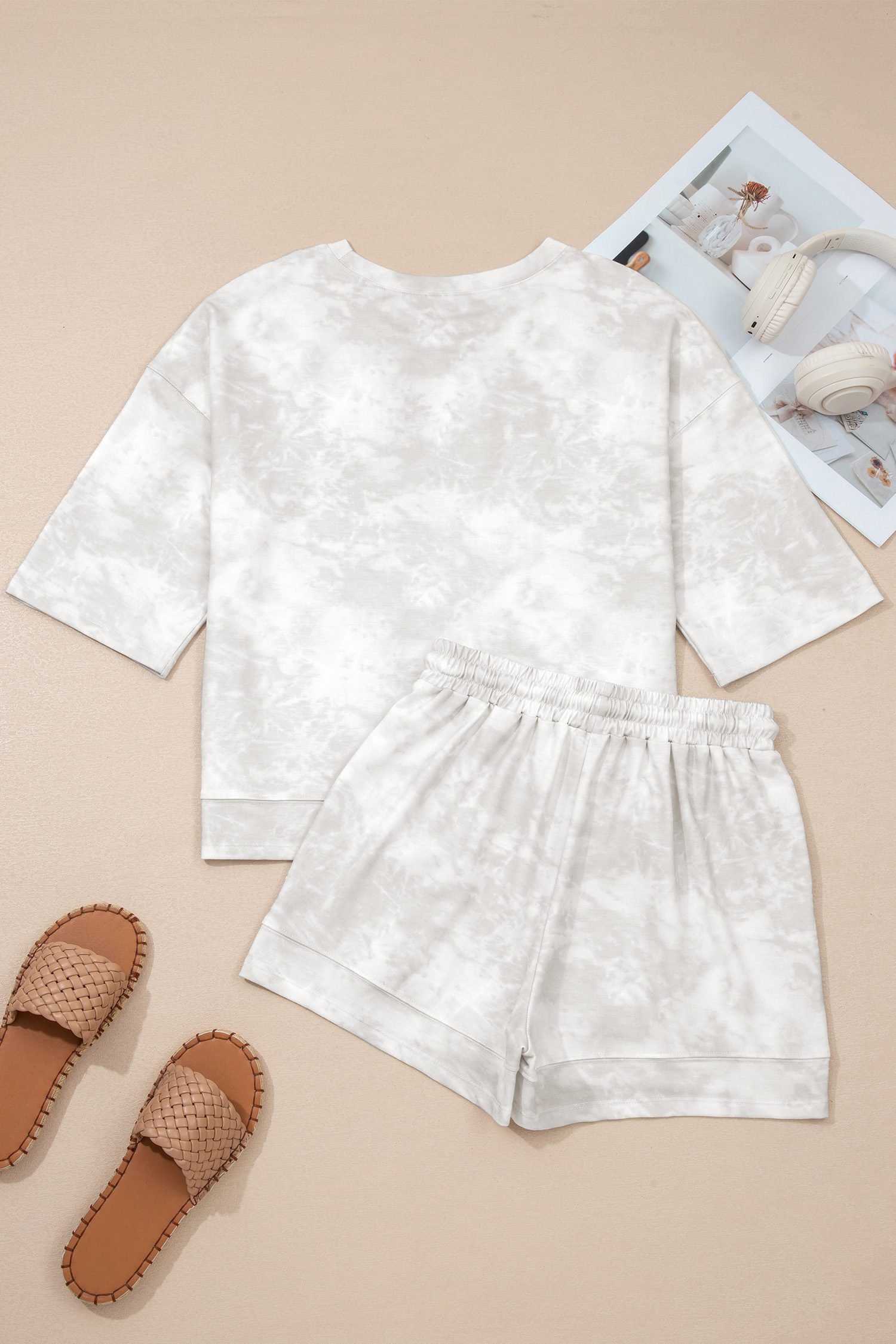 Vintage tie dye print adds retro style to this women’s two piece short set.
