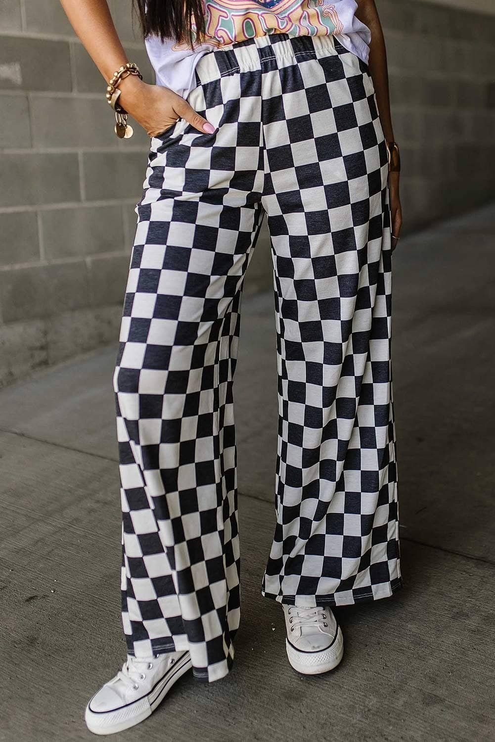- These pants present a striking two-tone checked print that lends a bold, fashionable statement.