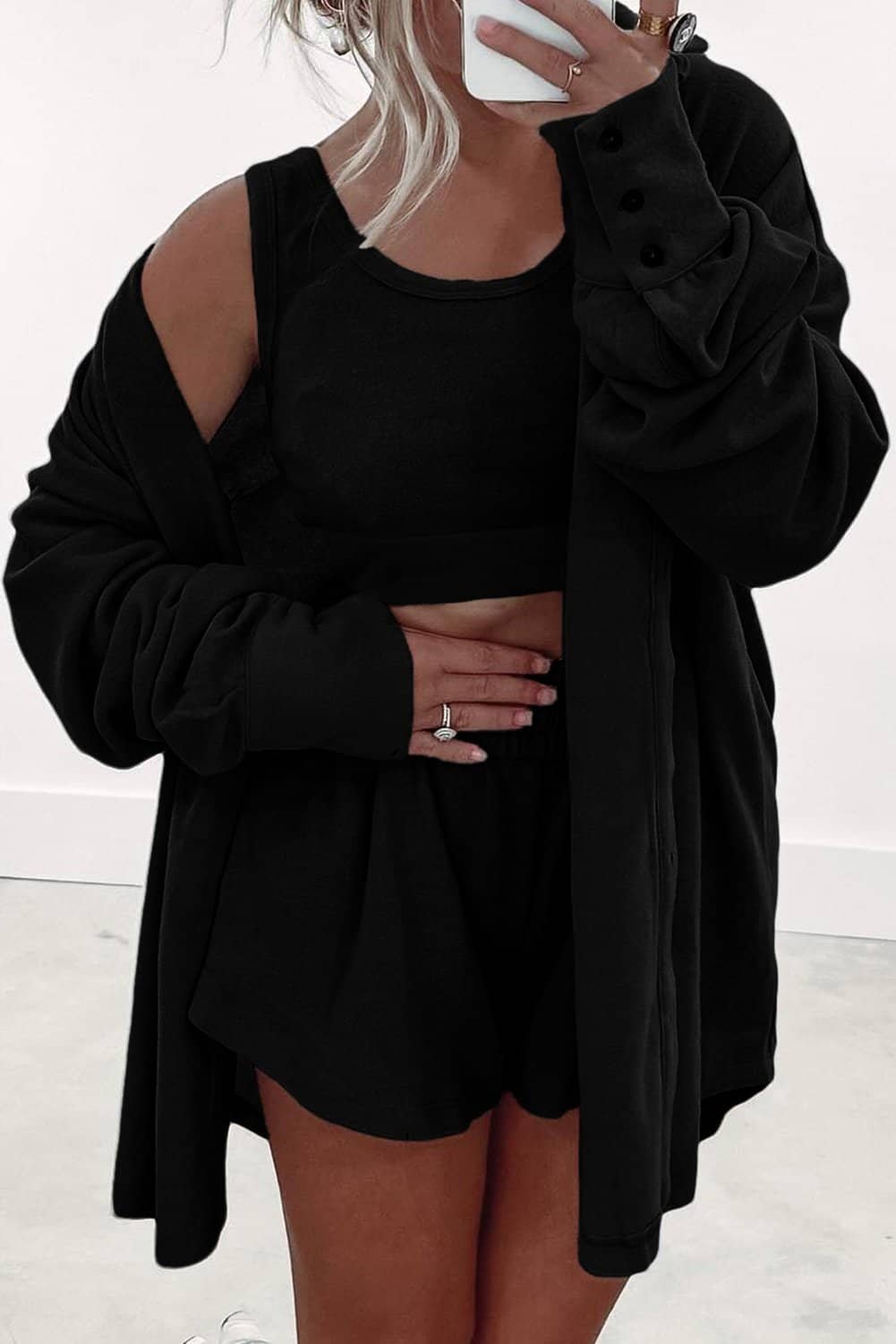 Includes crop tank top, shorts, and cardigan.