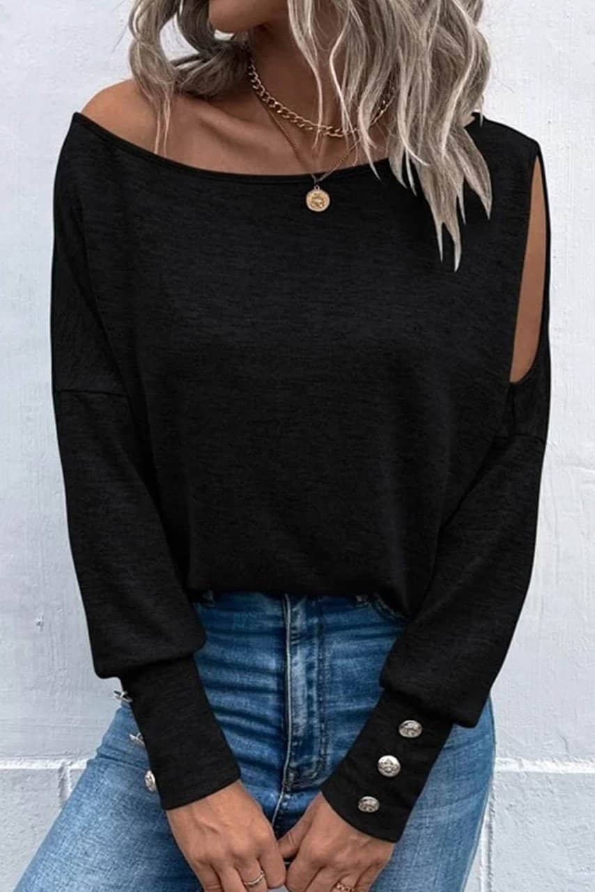 Black Asymmetrical Cut Out Buttoned Long Sleeve Top