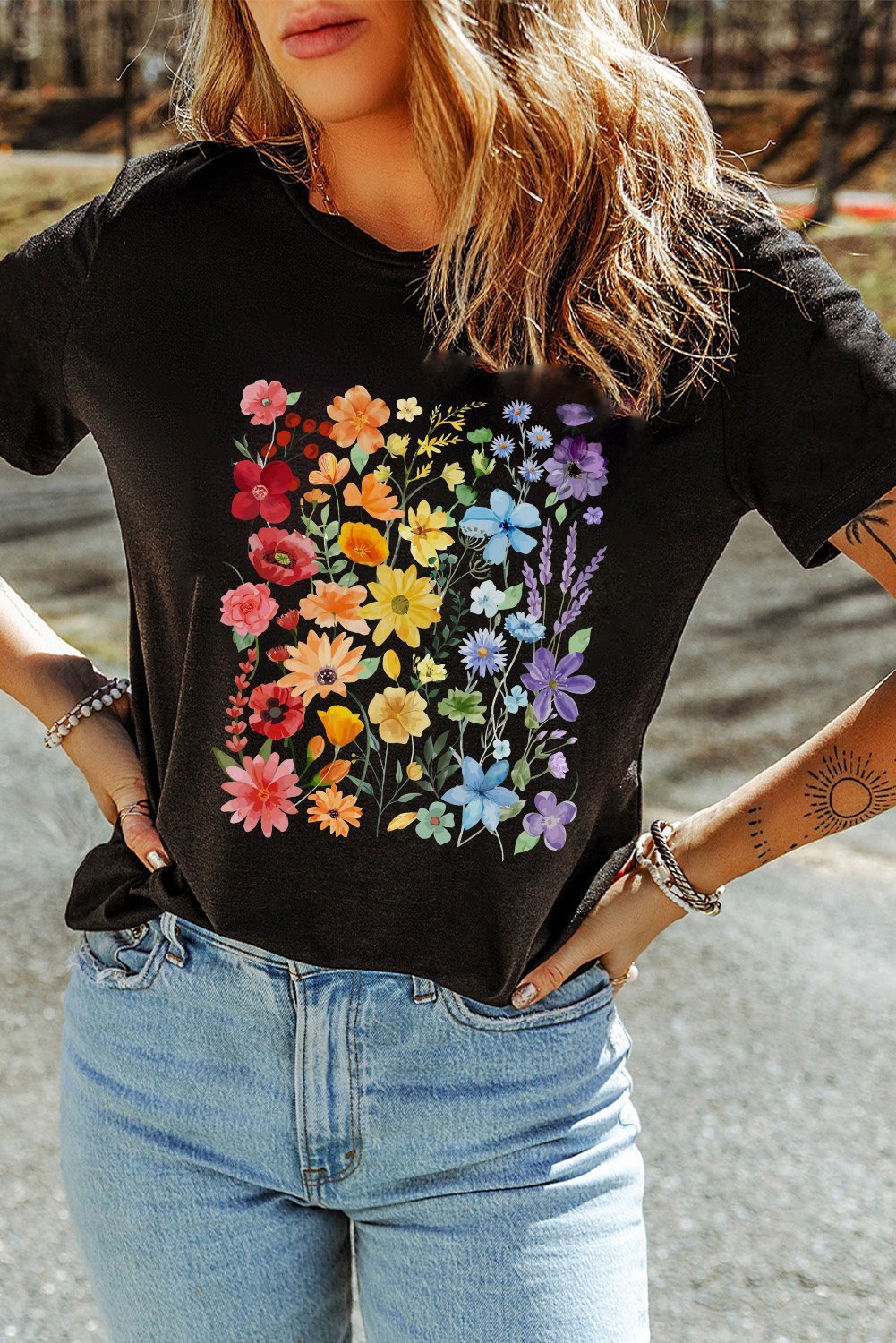 Black Beautiful Flower Print Cotton Blend Casual Tee