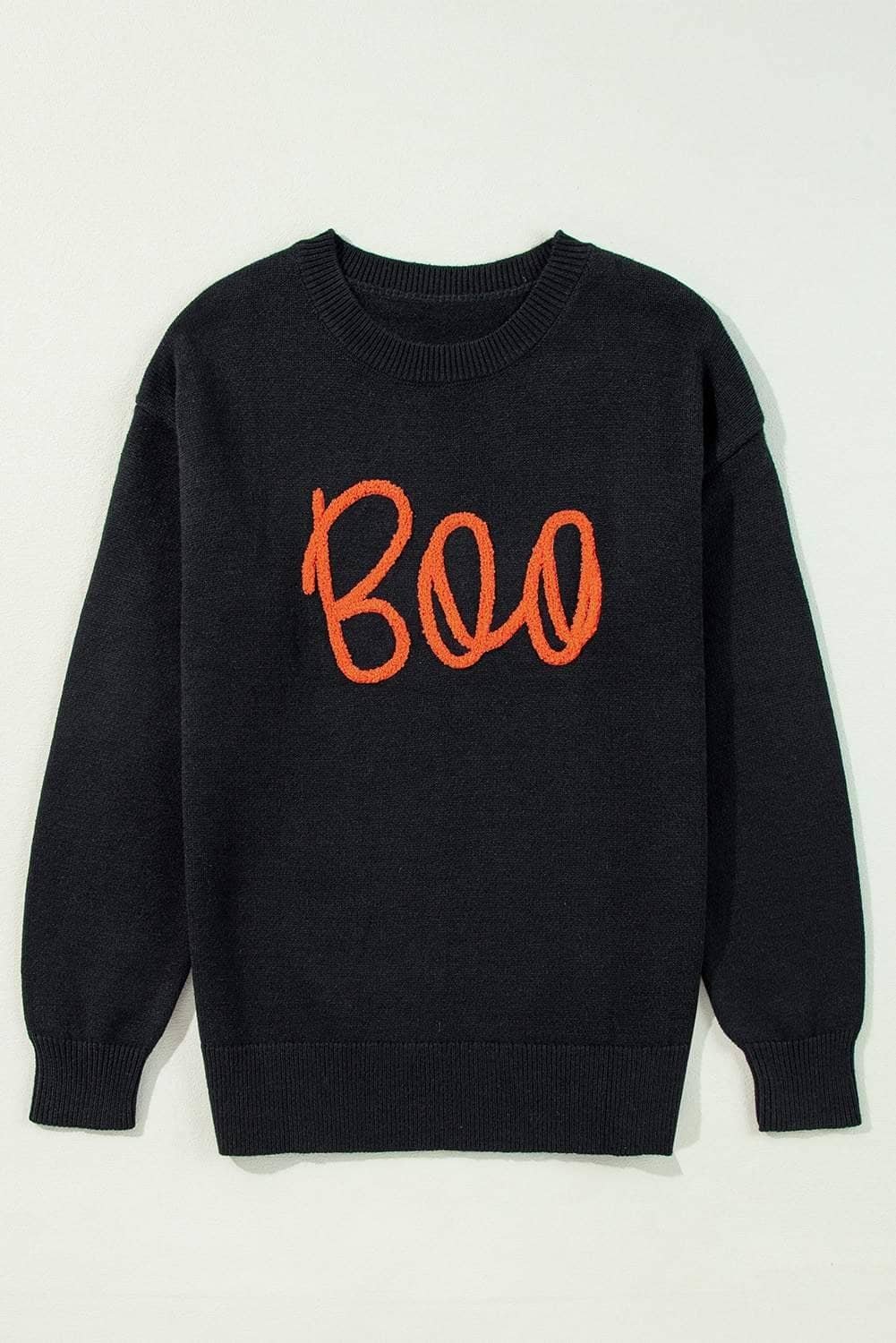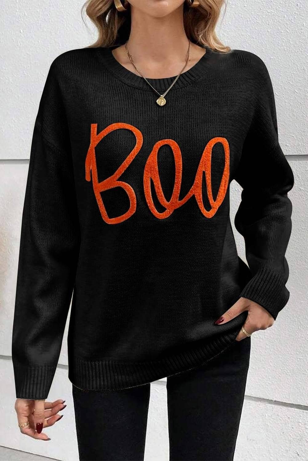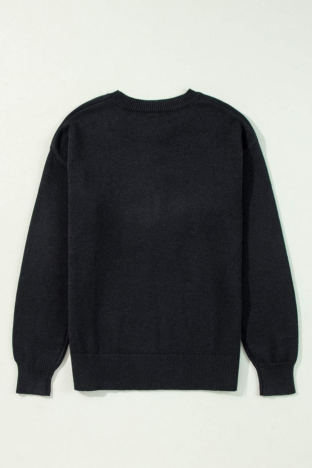 Black Boo Knitted Pattern Ribbed Edge Drop Shoulder Sweater