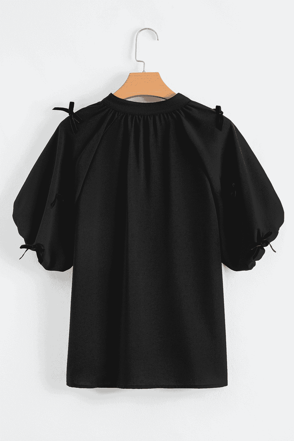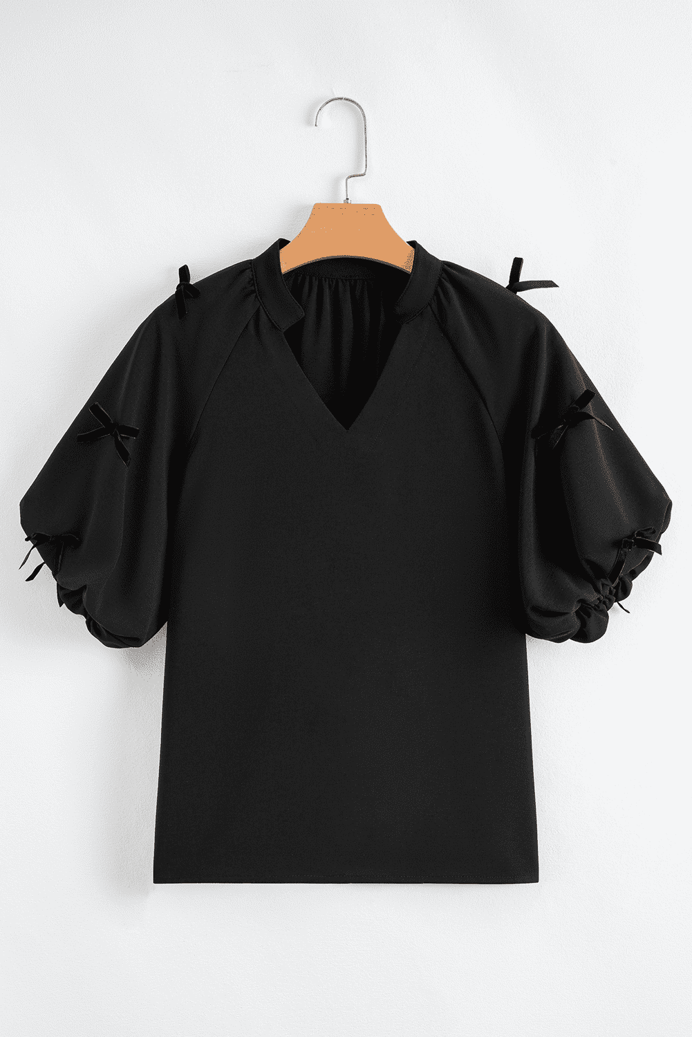- This Bow Decor Puff Sleeve Split V Neck Blouse is perfect to elevate your style.