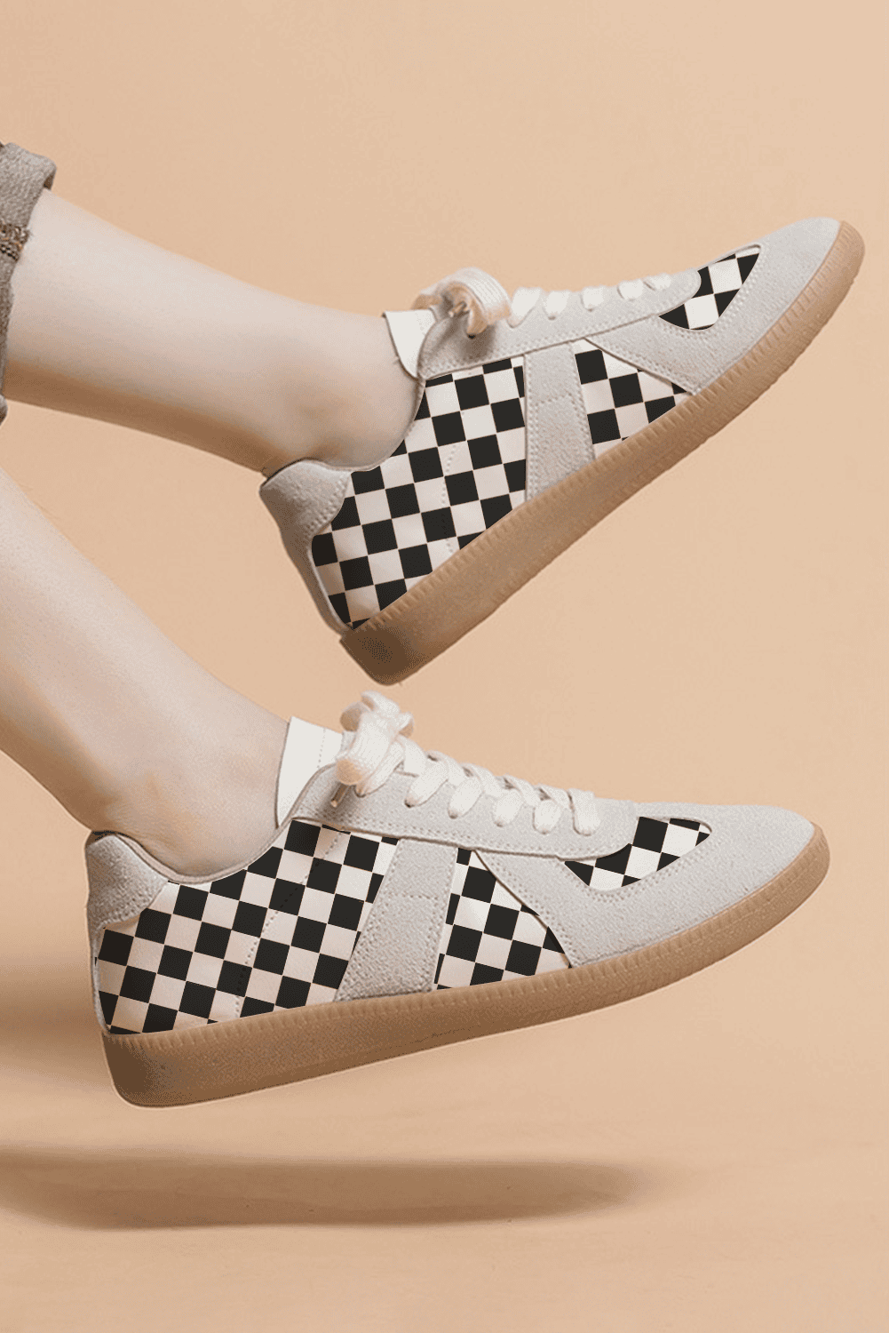 Black Checkerboard Patchwork Lace-Up Flat Leatherette Shoes