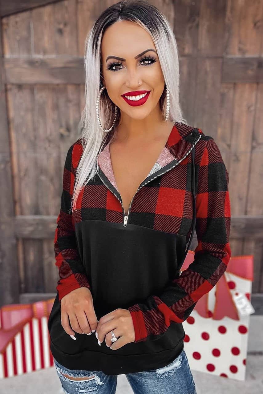 - This hooded top is fashionable with the timeless buffalo plaid patchwork