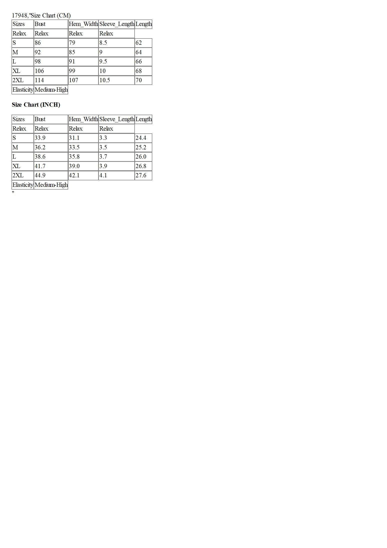 Sizes | Bust | Hem_Width | Sleeve_Length | Length |