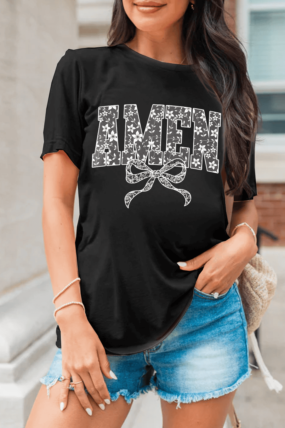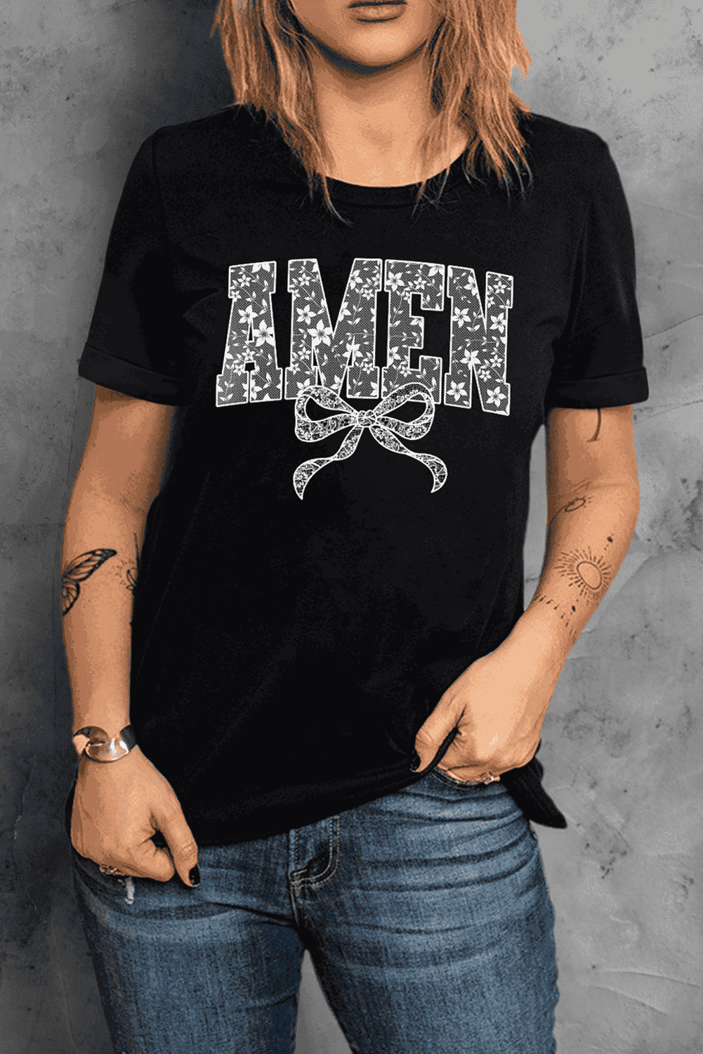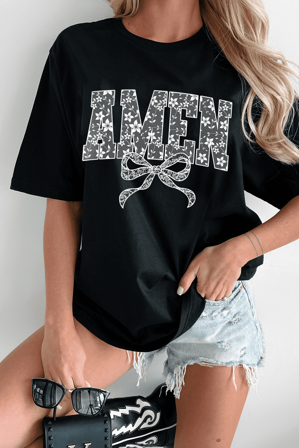 Black Floral Amen Bow Printed T Shirt