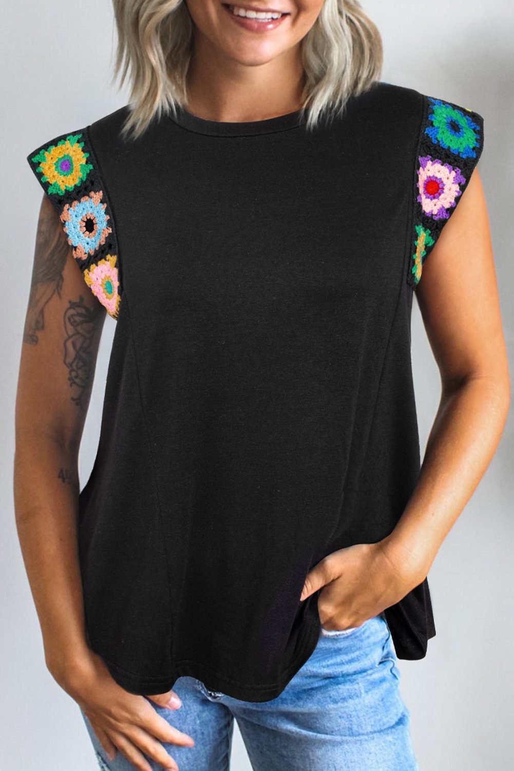 Black Floral Crochet Patched Sleeve Crew Neck Casual Tank Top