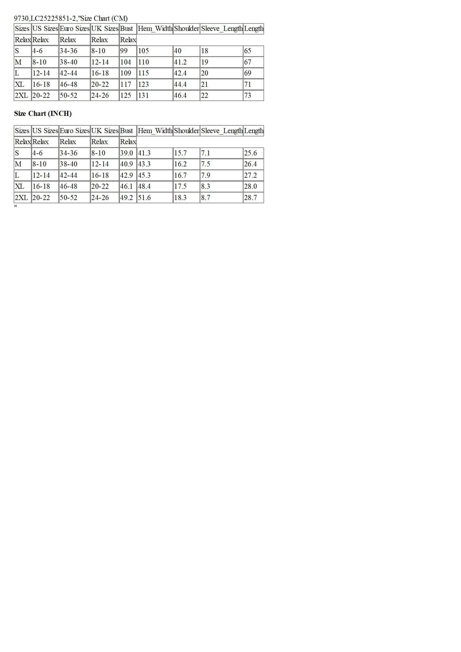 Sizes | US Sizes | Euro Sizes | UK Sizes | Bust | Hem_Width | Shoulder | Sleeve_Length | Length |