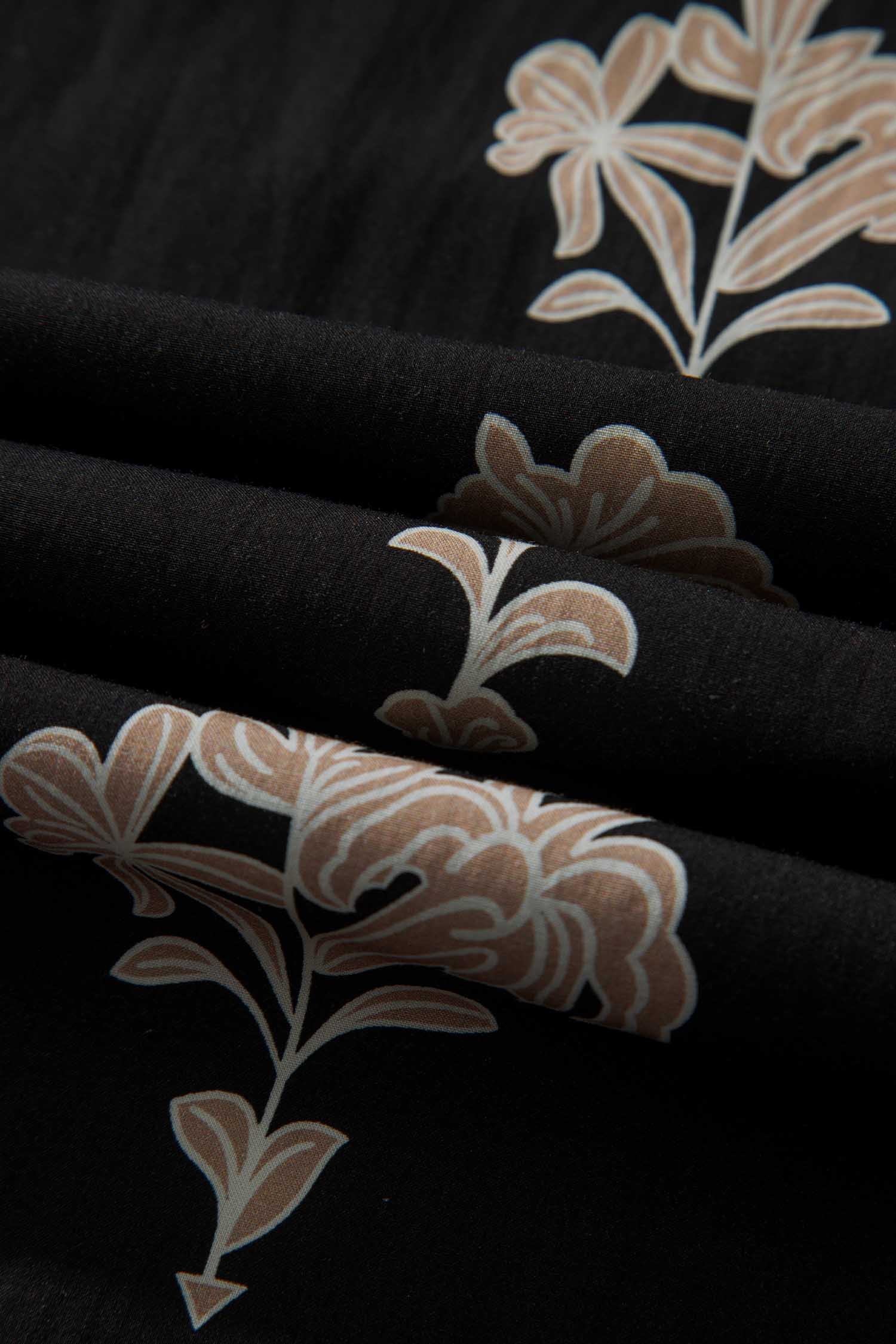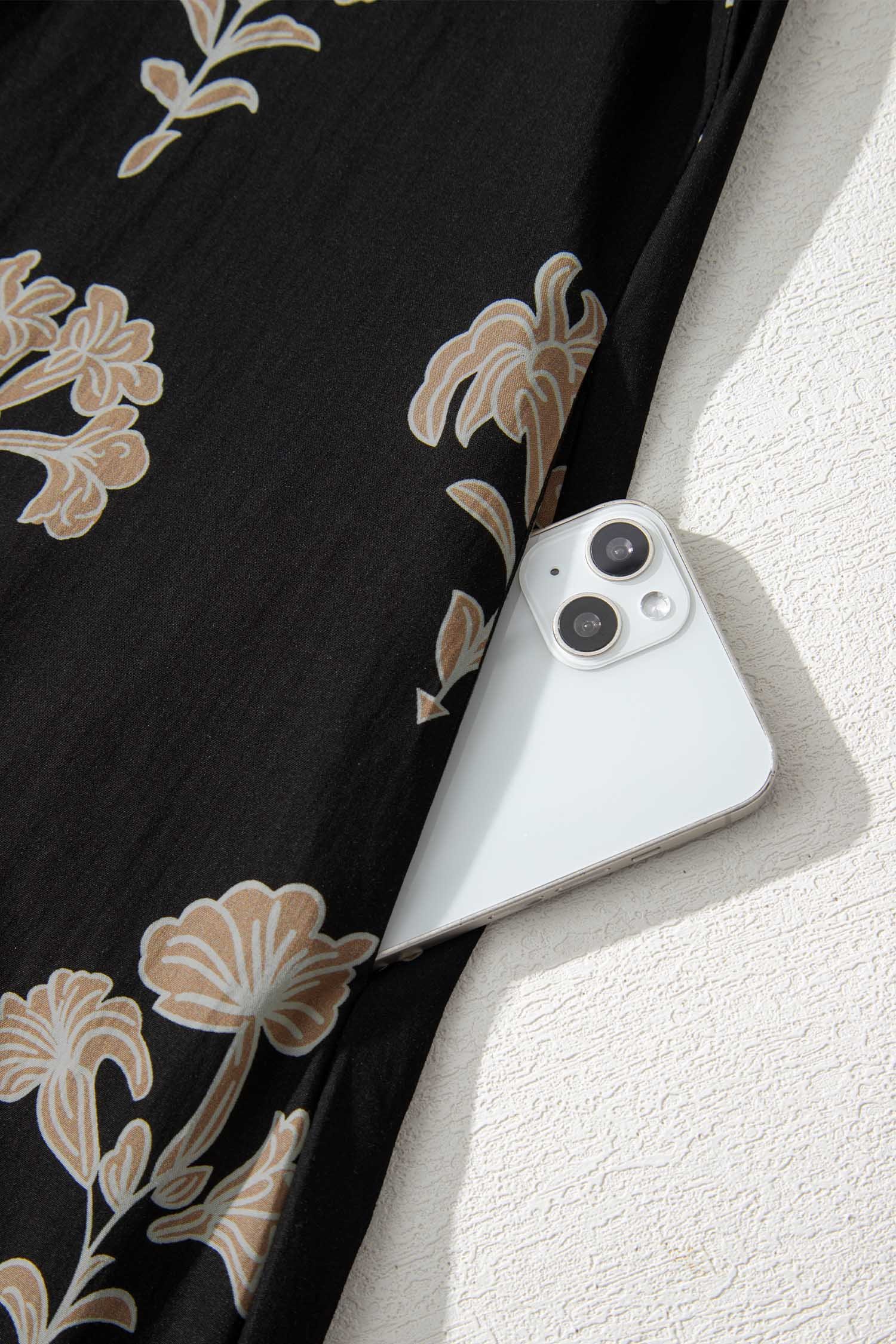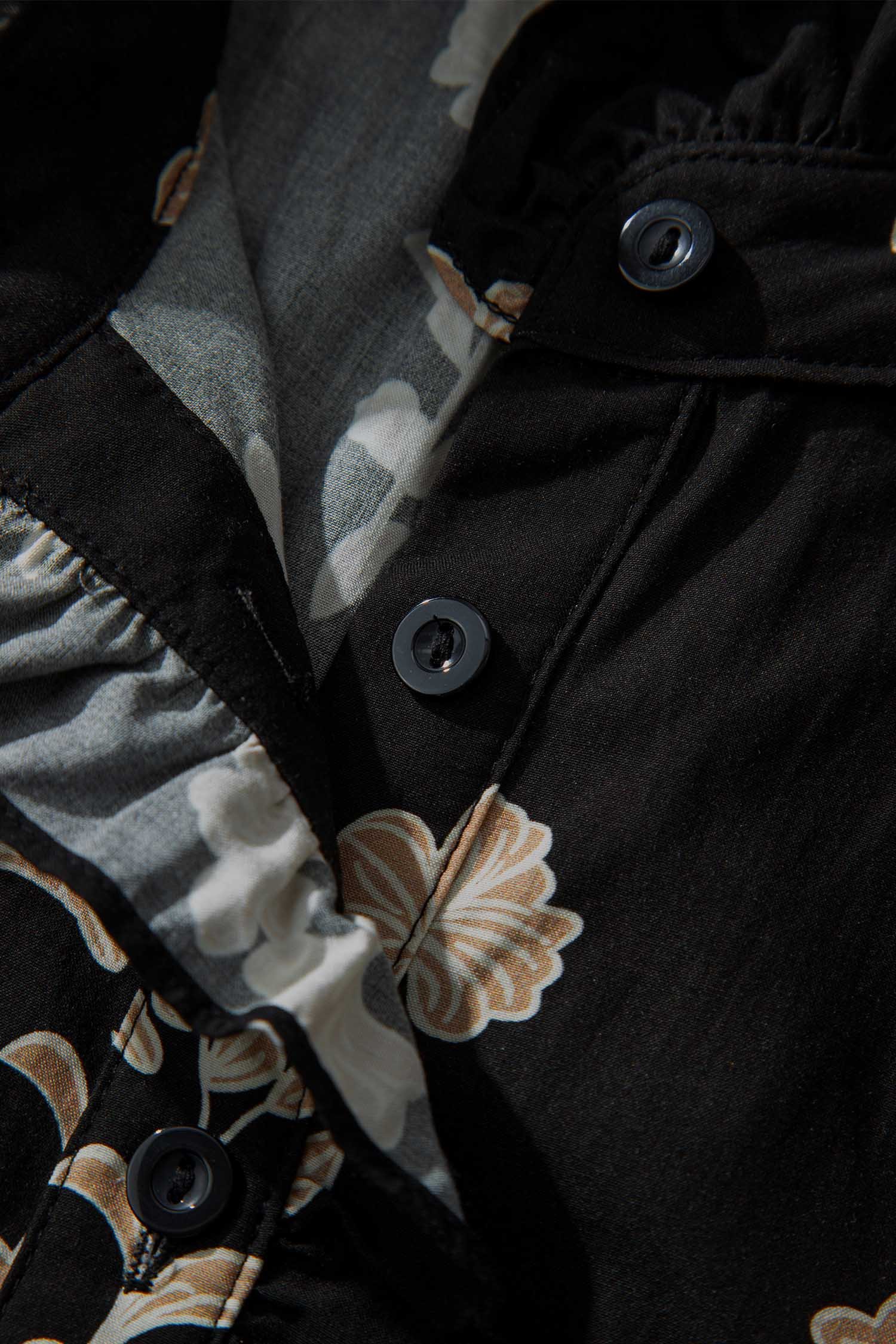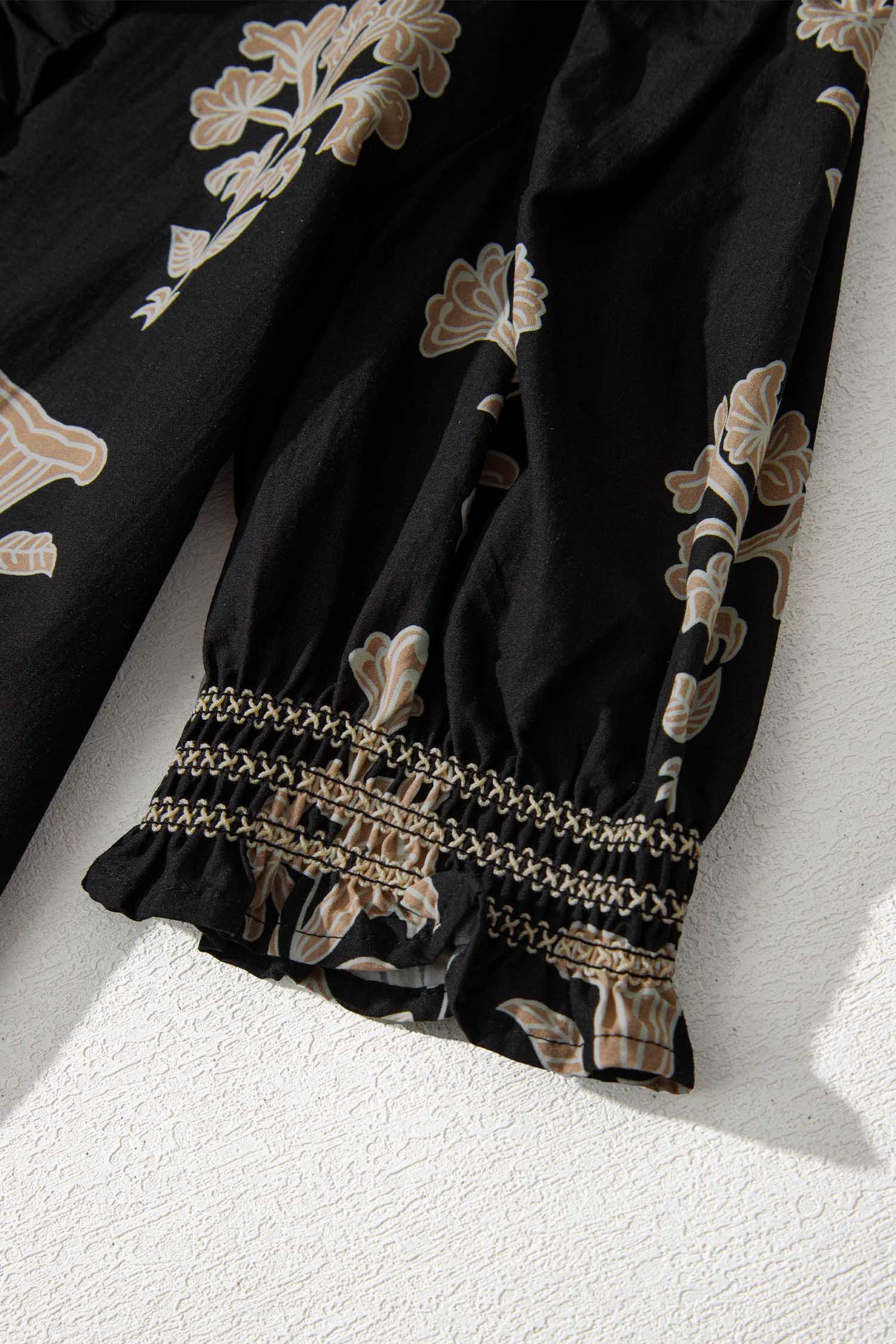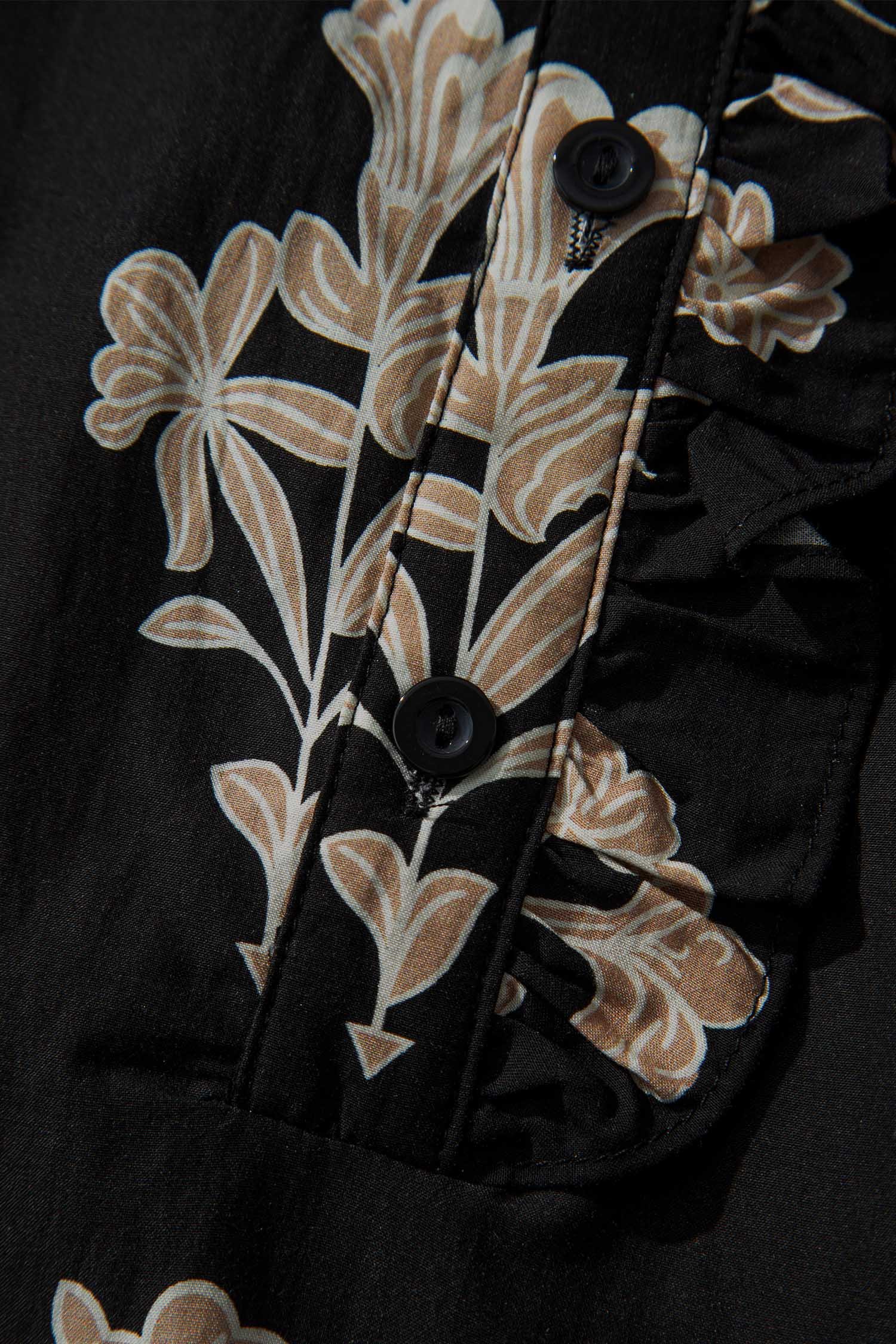 Floral print maxi dress features a frilled collar for elegant detail.