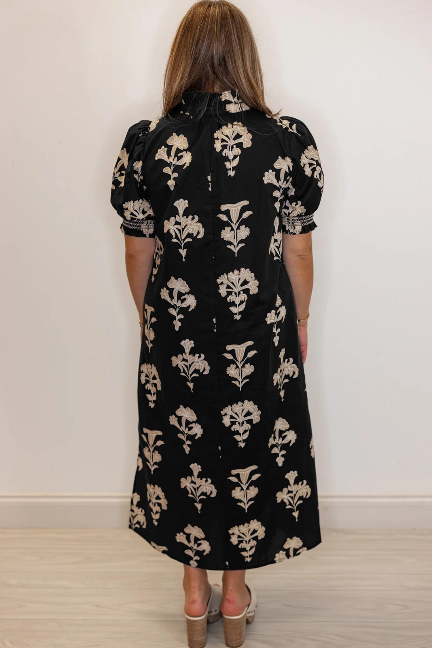Short puff sleeves add feminine volume and balanced proportions.
