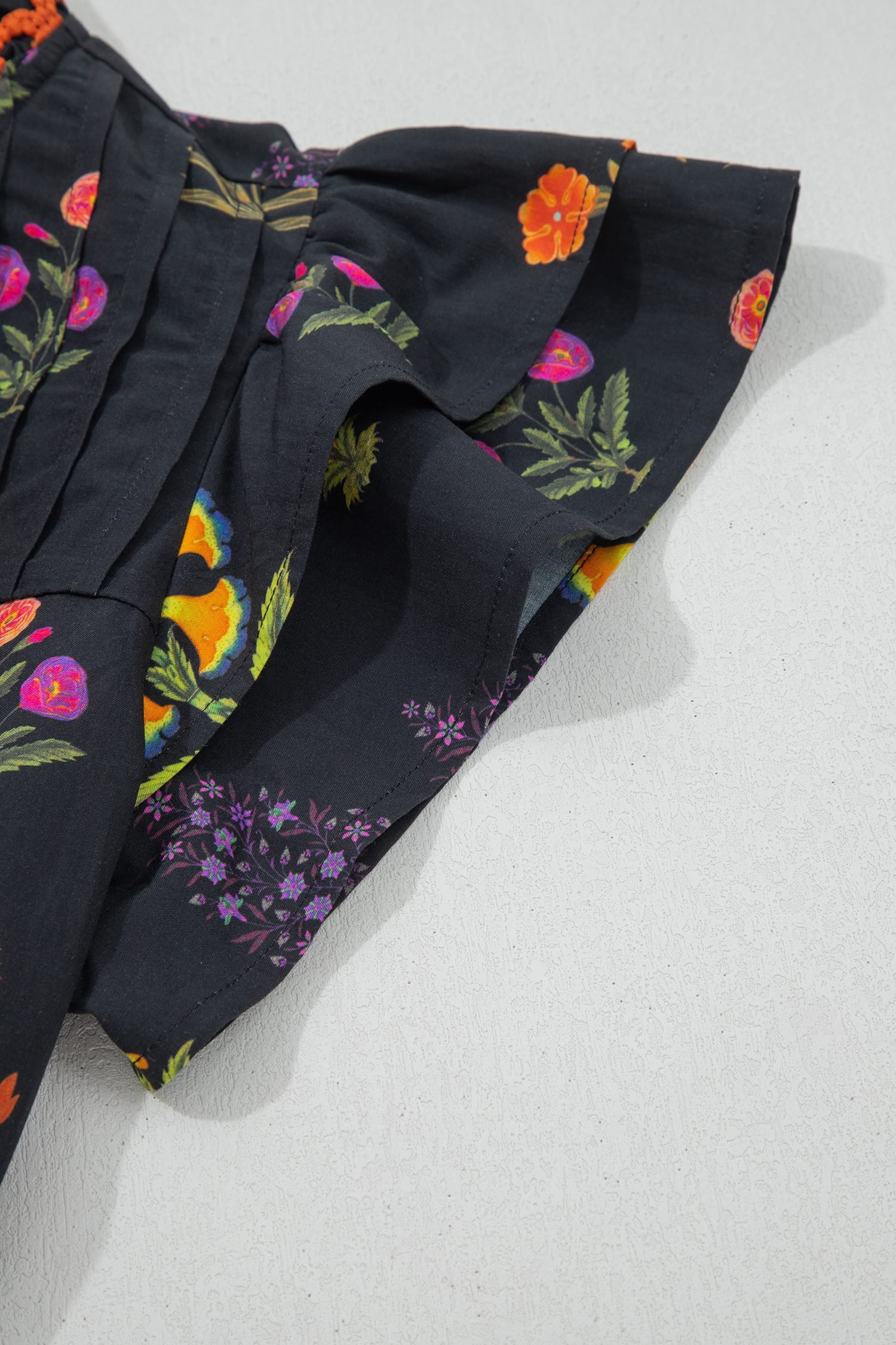 Floral print shirt features lace trim accents with a feminine frilled V neck.