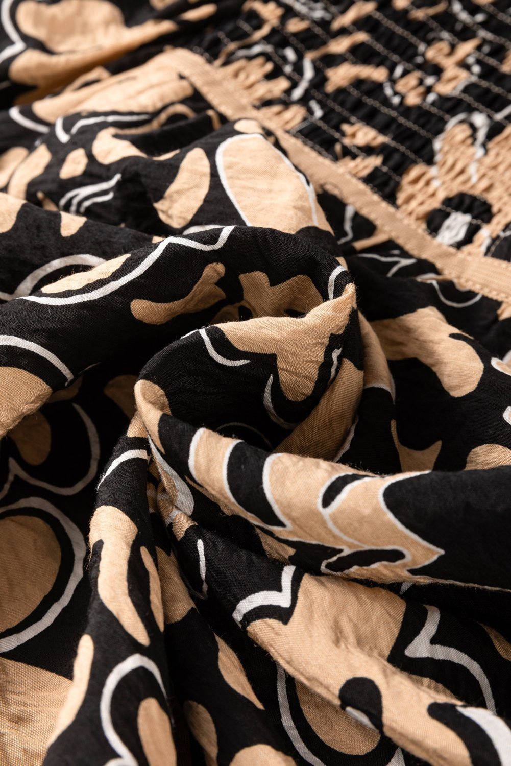 Black Floral Shirred Yoke Bracelet Sleeve Split Neck Boho Blouse