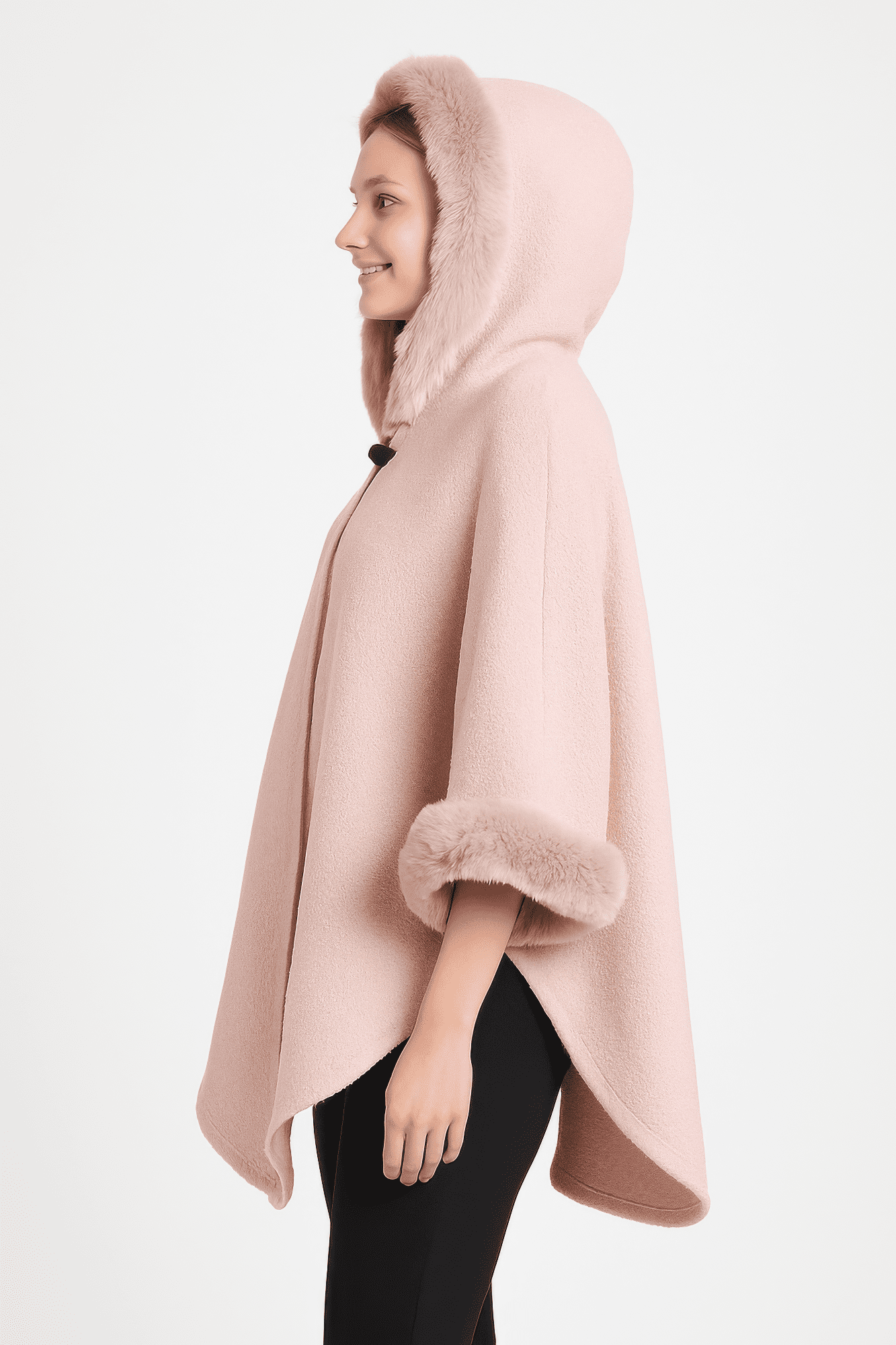 Product Description: Wrap yourself in warmth and elegance with this black hooded cape, finished with plush faux fur trim for a luxurious touch. The roomy hood and wide sleeves offer comfort and drama, while the simple front closure keeps the silhouette clean and effortless. Crafted from soft, textured fabric, this cape is perfect for layering over your winter favorites. Timeless and versatile, it’s an ideal outerwear piece for cool-weather outings, dressy occasions, or stylish everyday wear. Product Details: Soft textured body with faux fur trim at hood and cuffs Generously sized hood for added warmth Wide sleeves and flowing silhouette for easy layering Front hook closure for a seamless finish Elegant and functional—perfect for day or night Ideal for cold-weather styling with elevated flair Size Guide: For accurate sizing guidance, please review our size chart available on the website. Shipping and Returns: Fast Shipping: We offer speedy delivery to your doorstep. Hassle-Free Returns: If you’re not completely satisfied, our flexible return policy ensures your peace of mind.