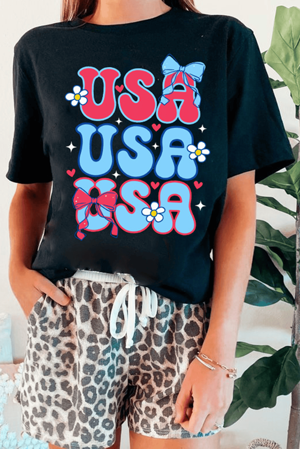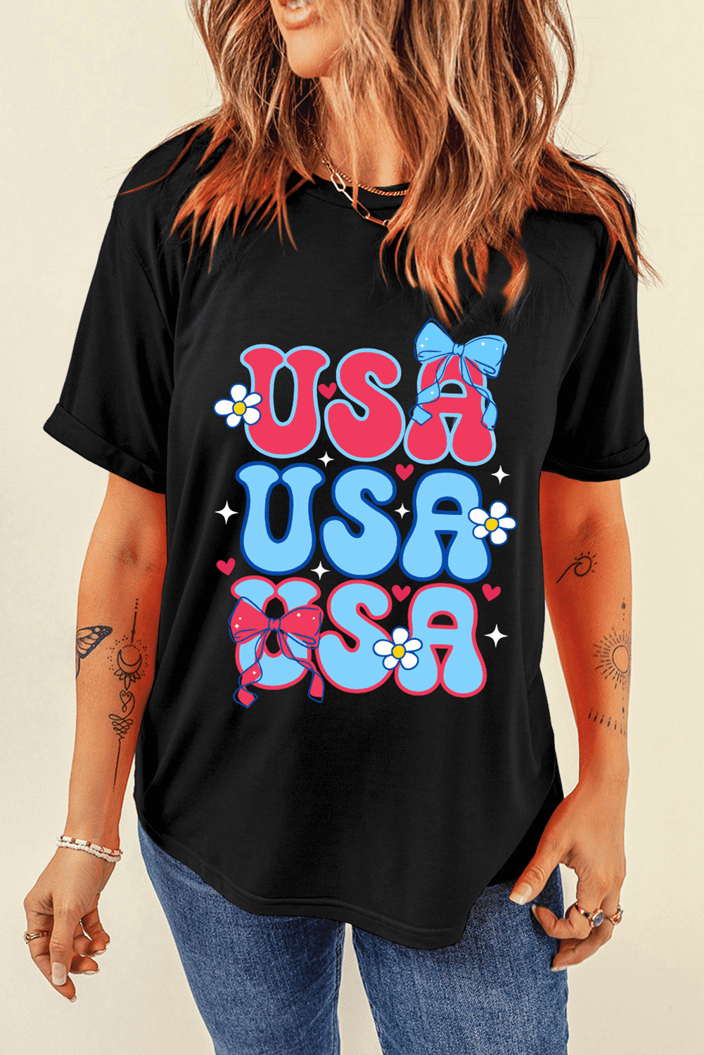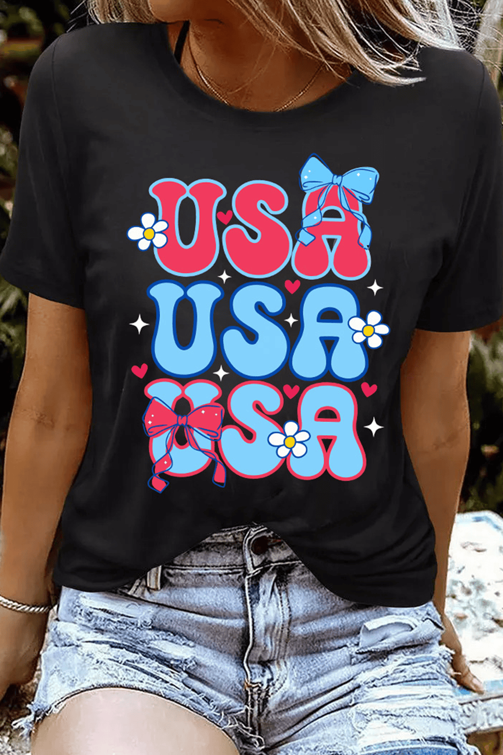 Black July 4Th Cute Flower Bow Usa Letter Graphic Tee