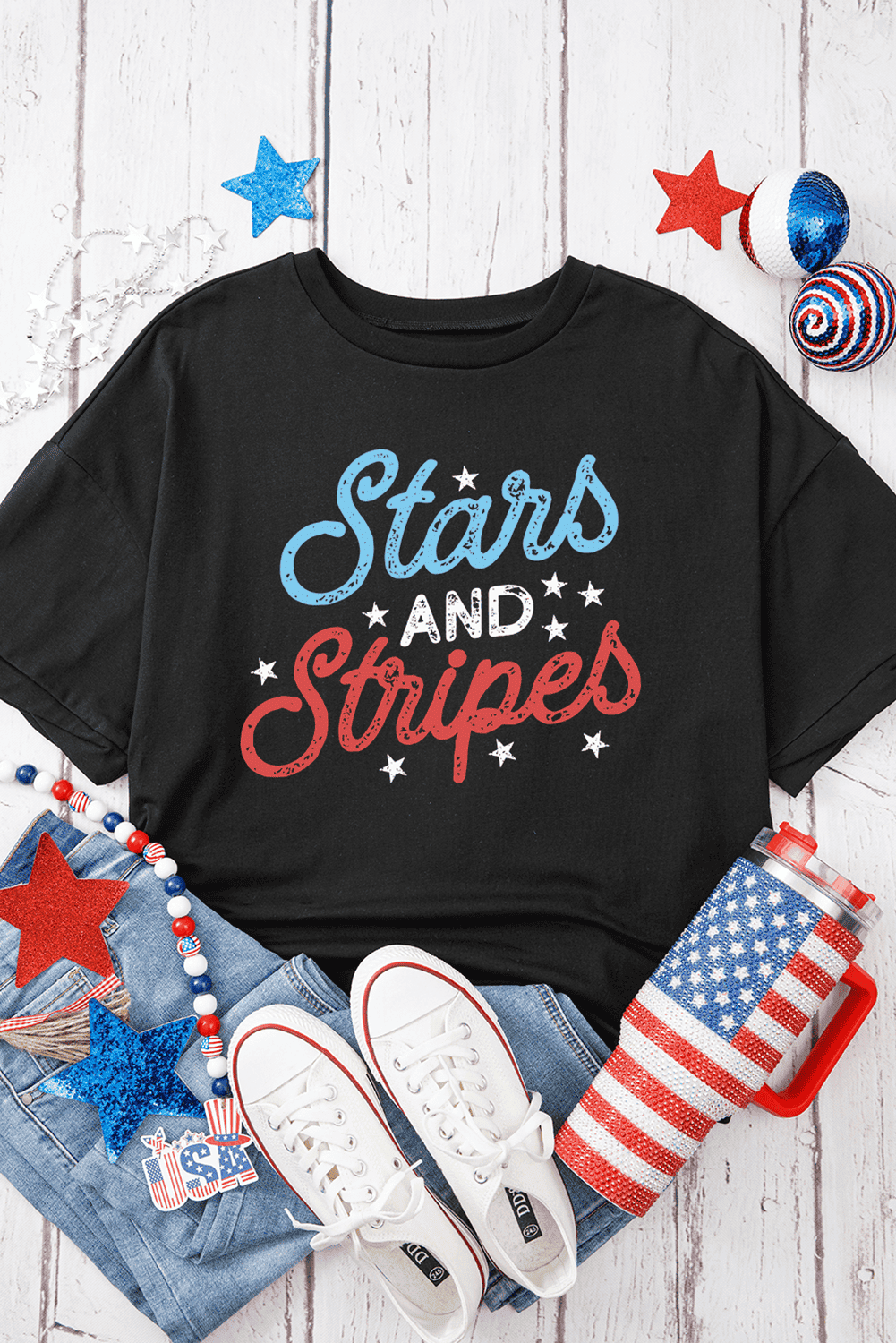 • Vintage-inspired Stars AND Stripes letter graphics for a patriotic appeal.
