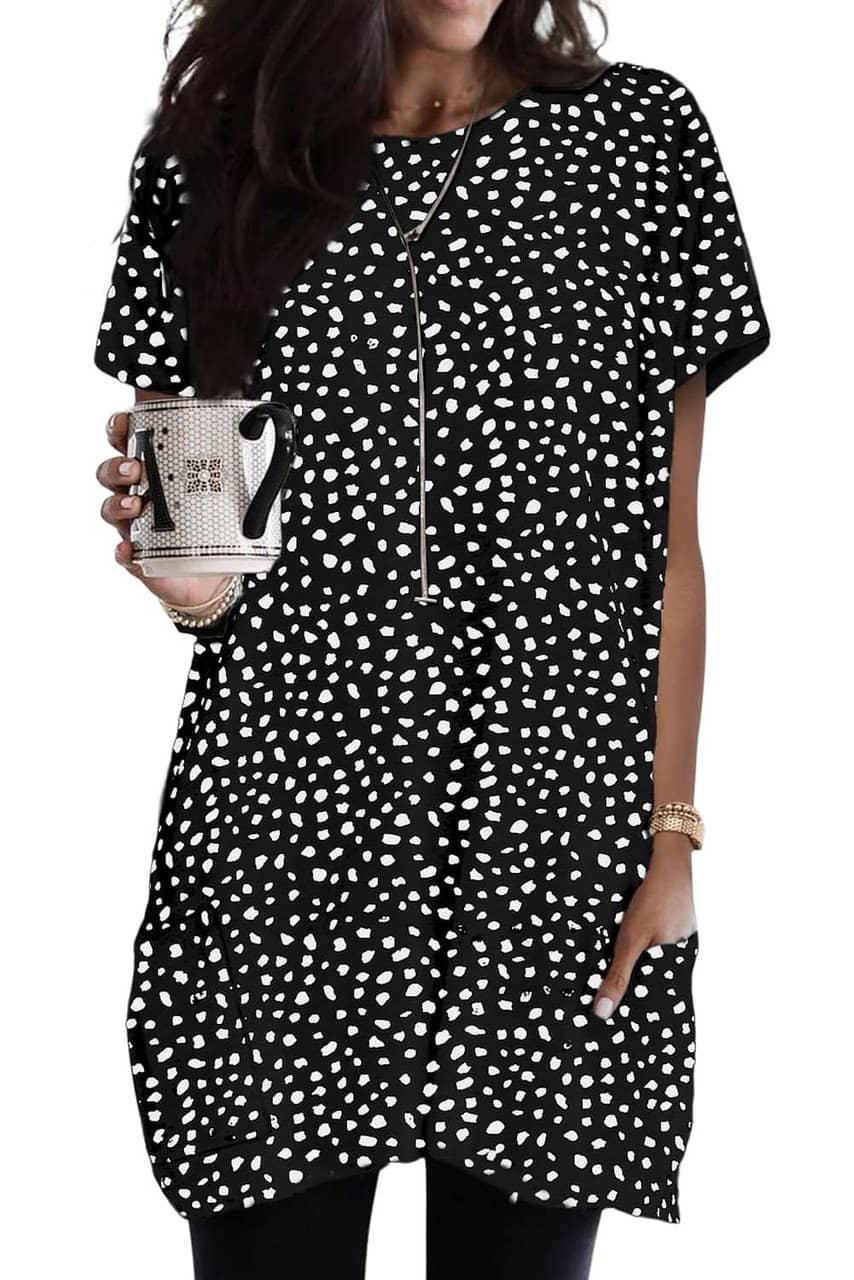 - Featured with a crew neck, short sleeve, side pockets, and tunic length