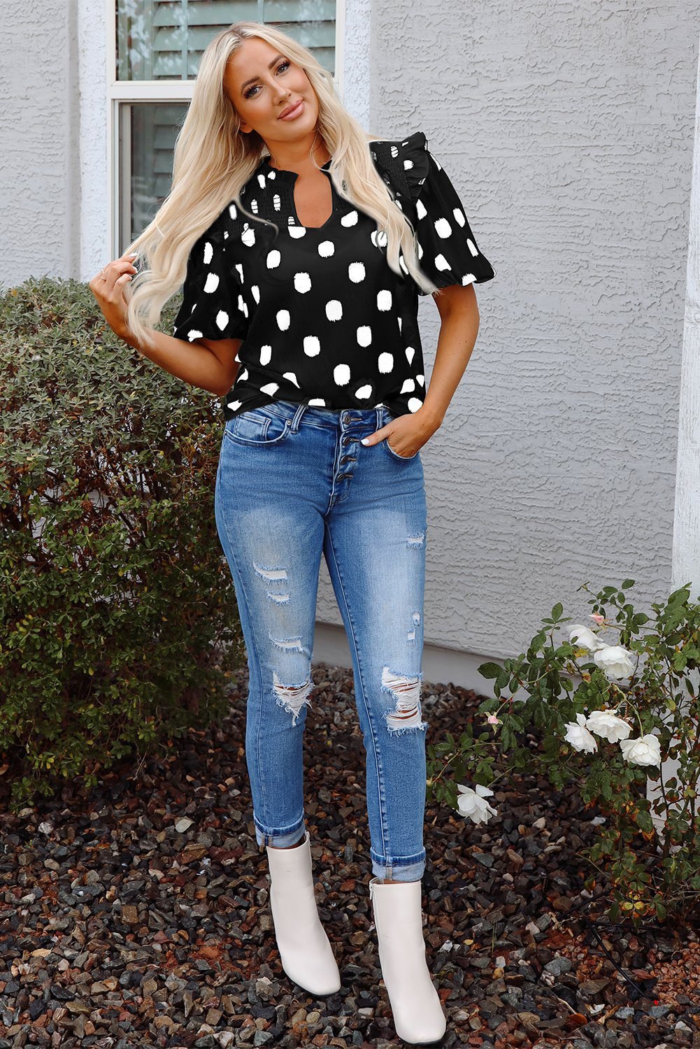 Black Polka Dot Print Shirred Yoke Notched Neck Balloon Sleeve Blouse
