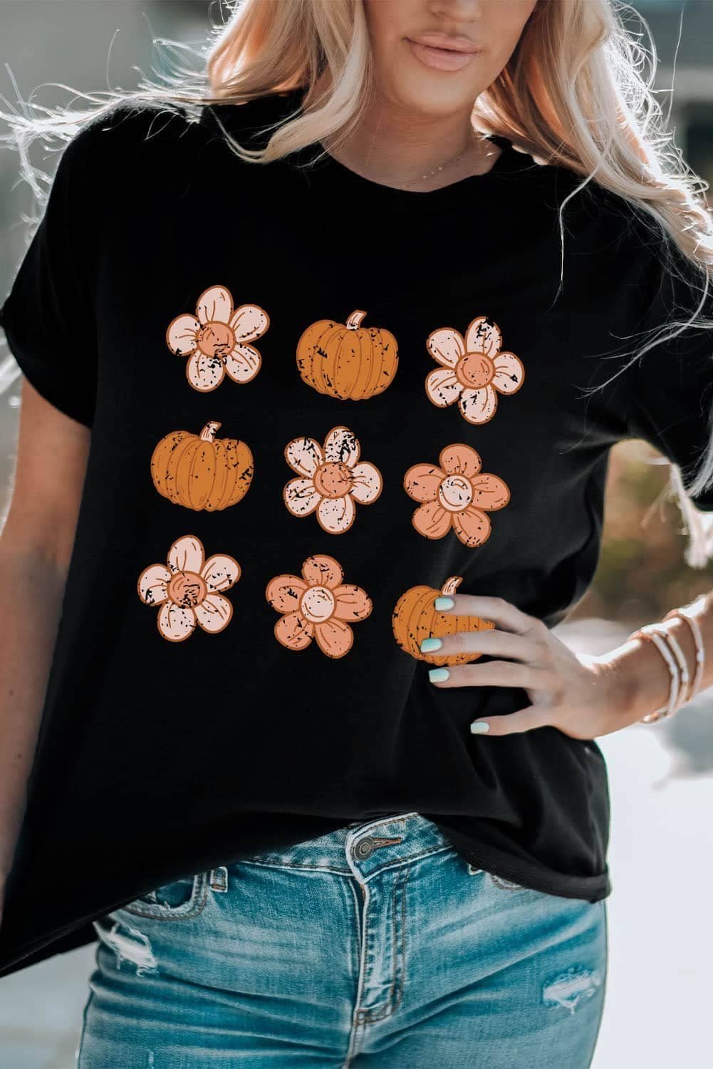 Pumpkin Flower Print Short Sleeve Graphic T Shirt
