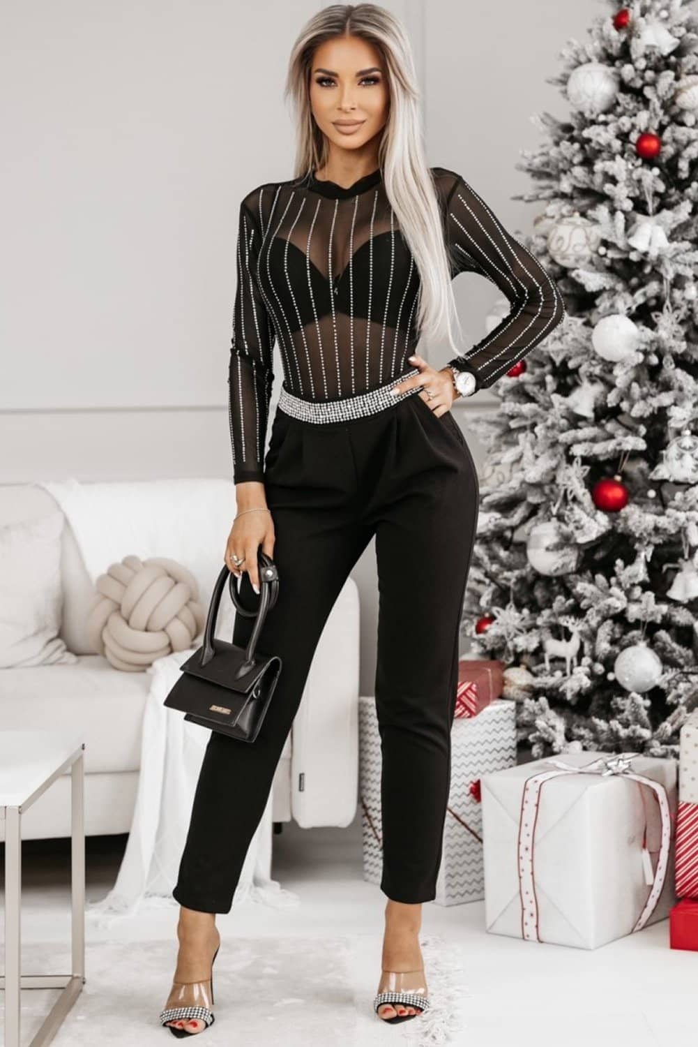 - Stunning rhinestone striped embellishments for a glistening look.