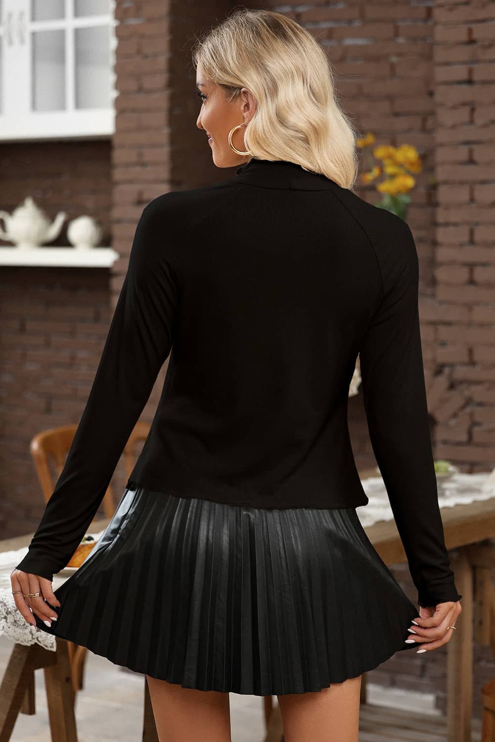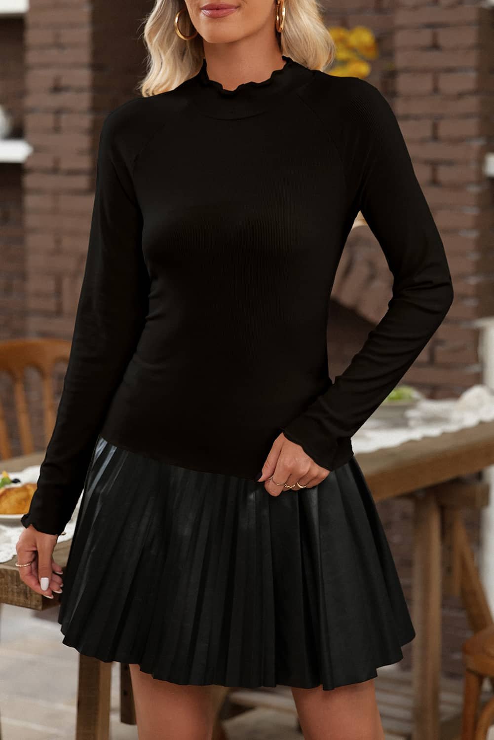 Be the first to review “Black Ribbed Knit Lettuce Trim High Neck Long Sleeve Top”