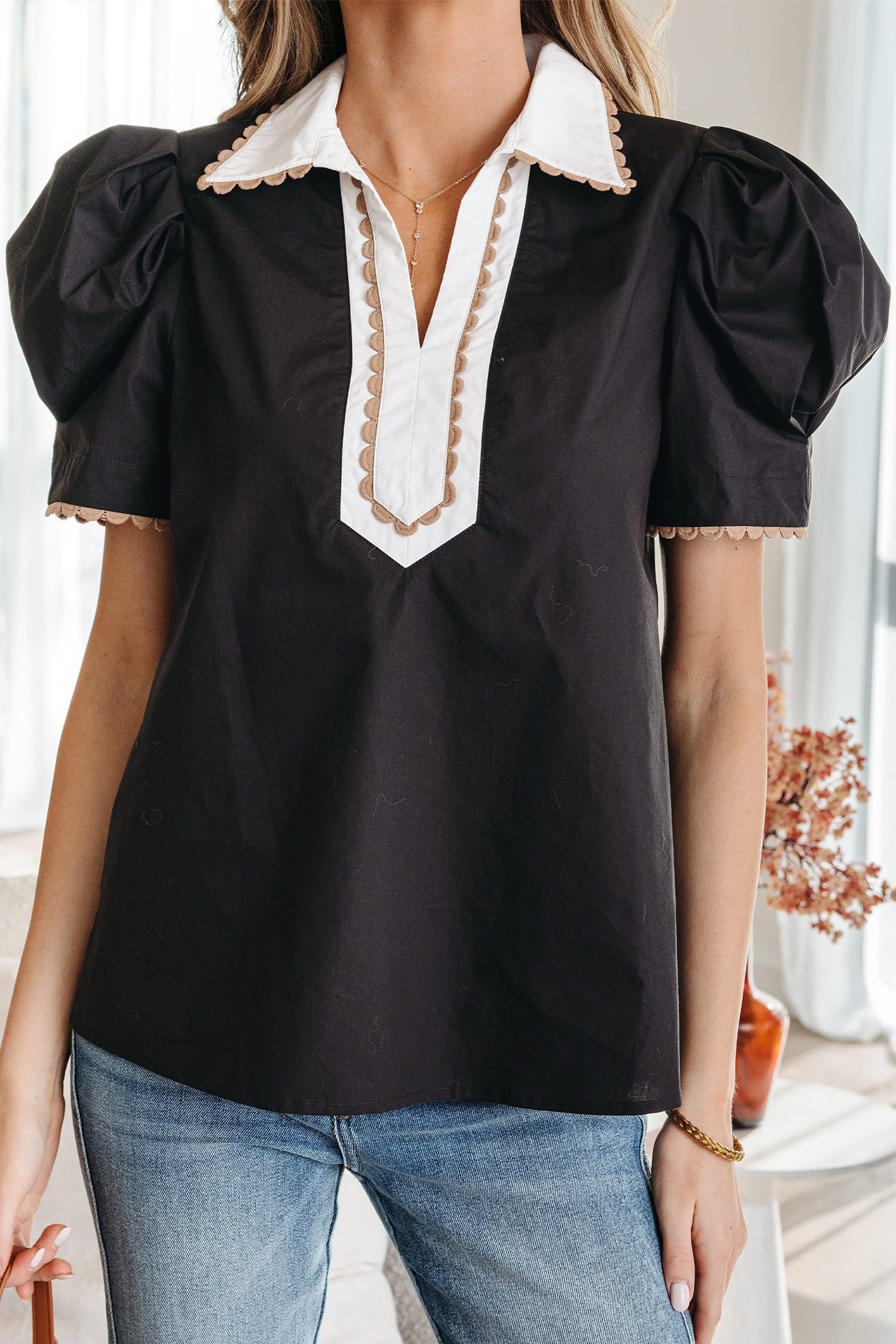 The ricrac trim adds this short sleeve top a delicate touch.