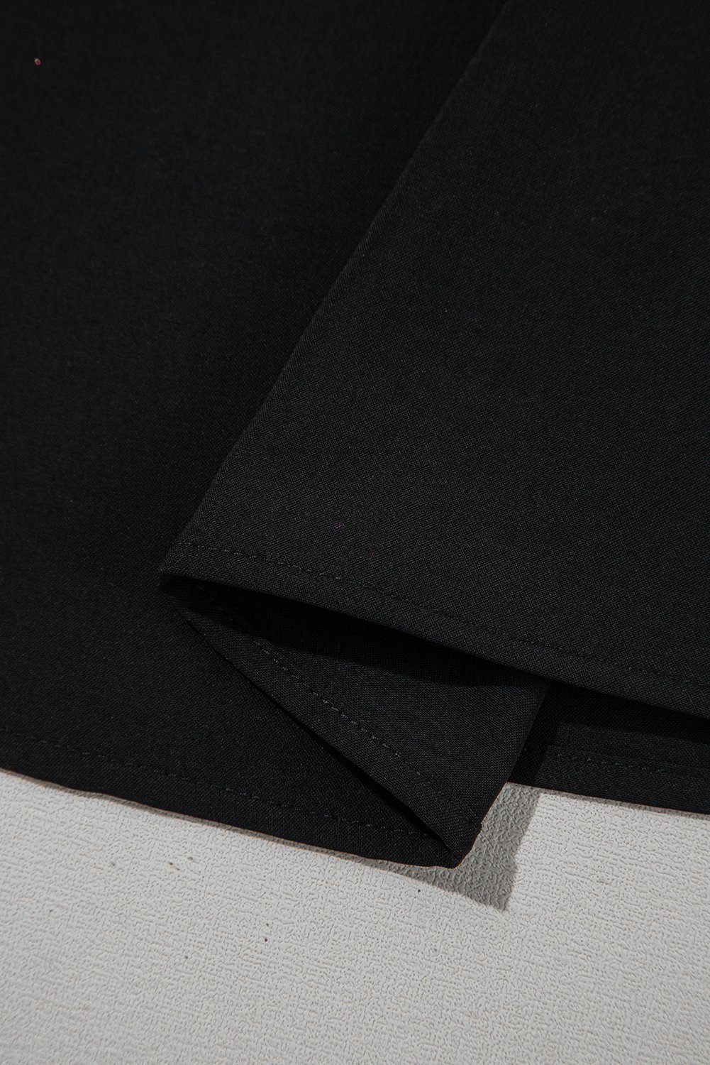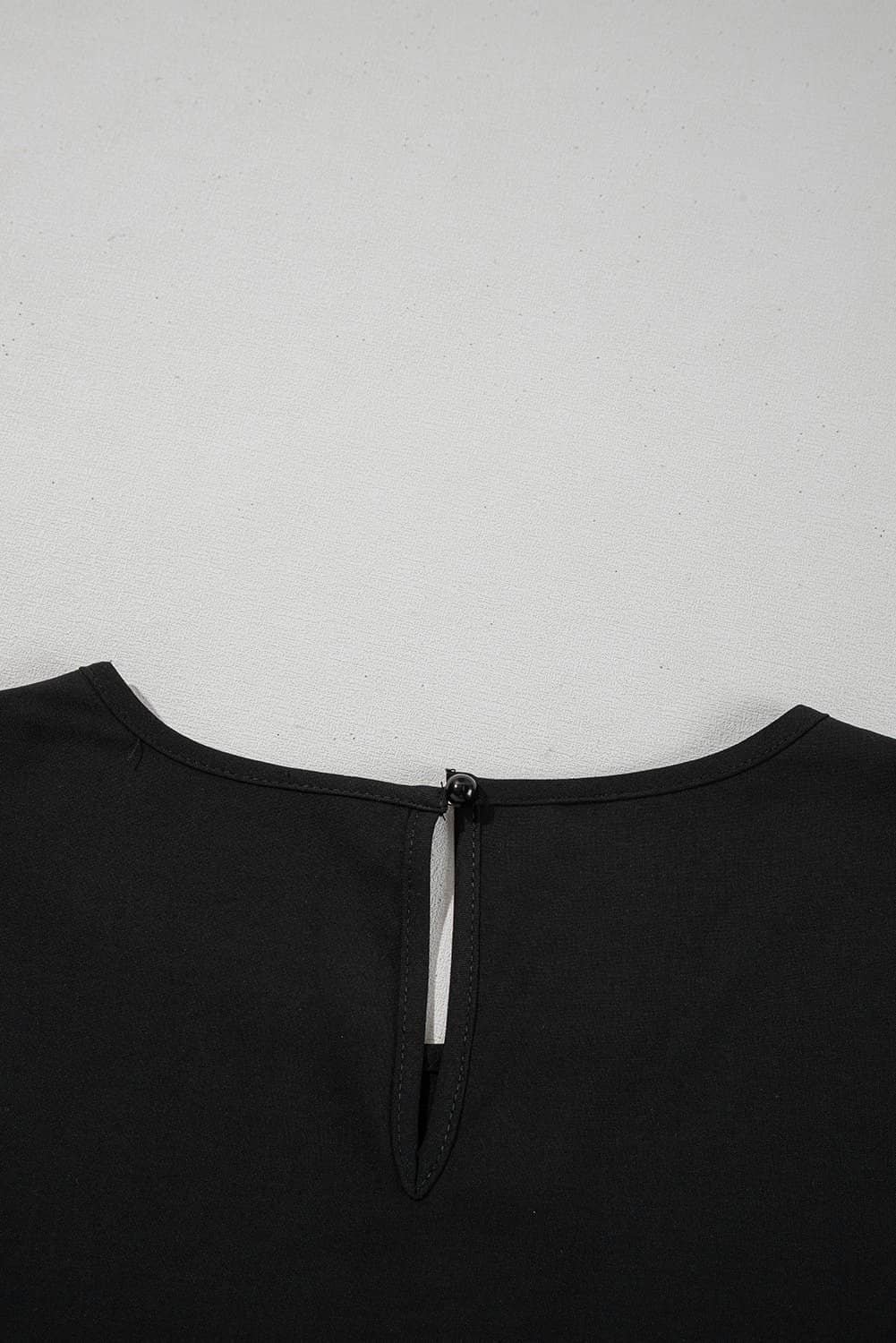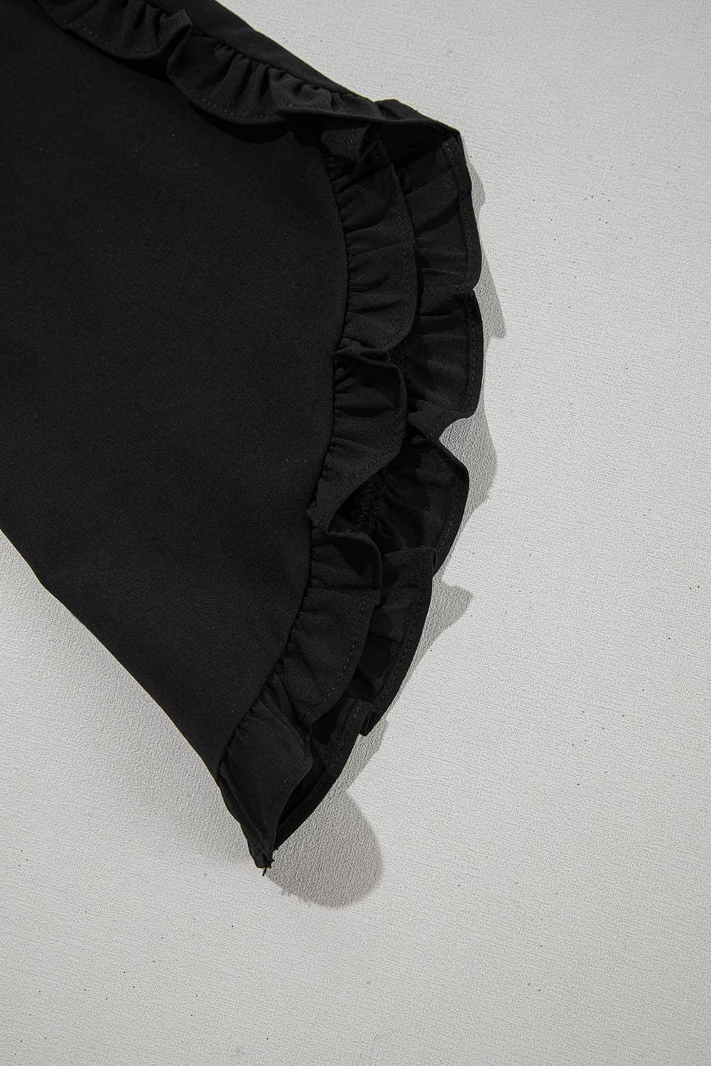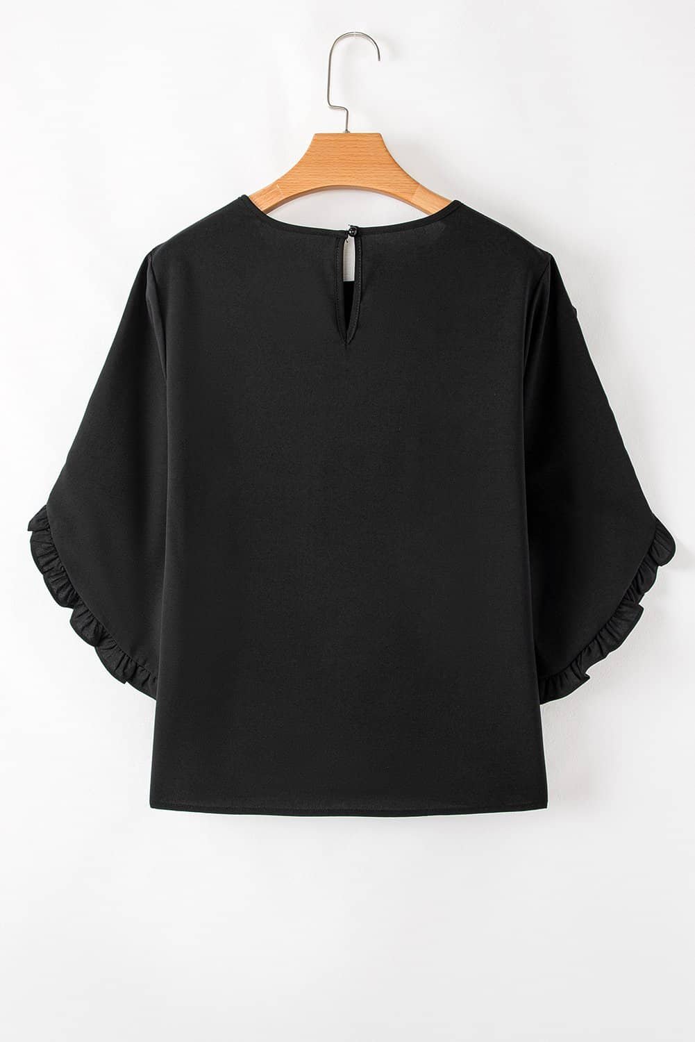 Solid color, round neckline, and 3/4 sleeves with ruffle details.