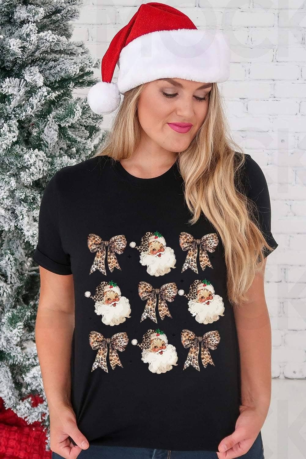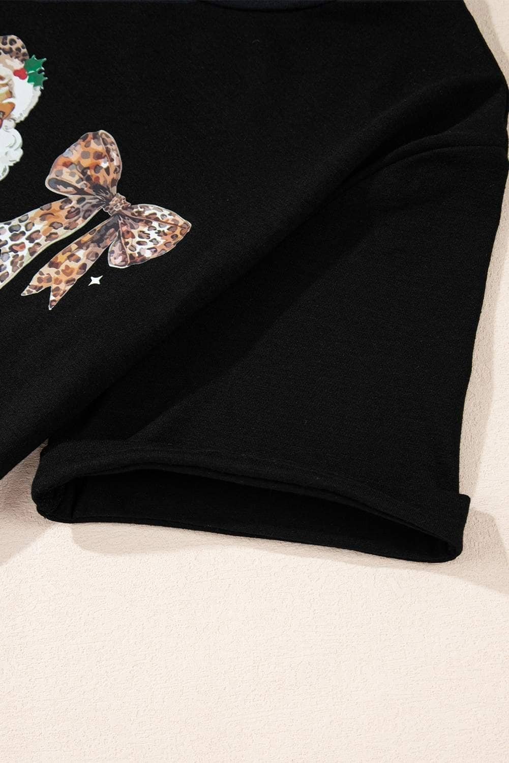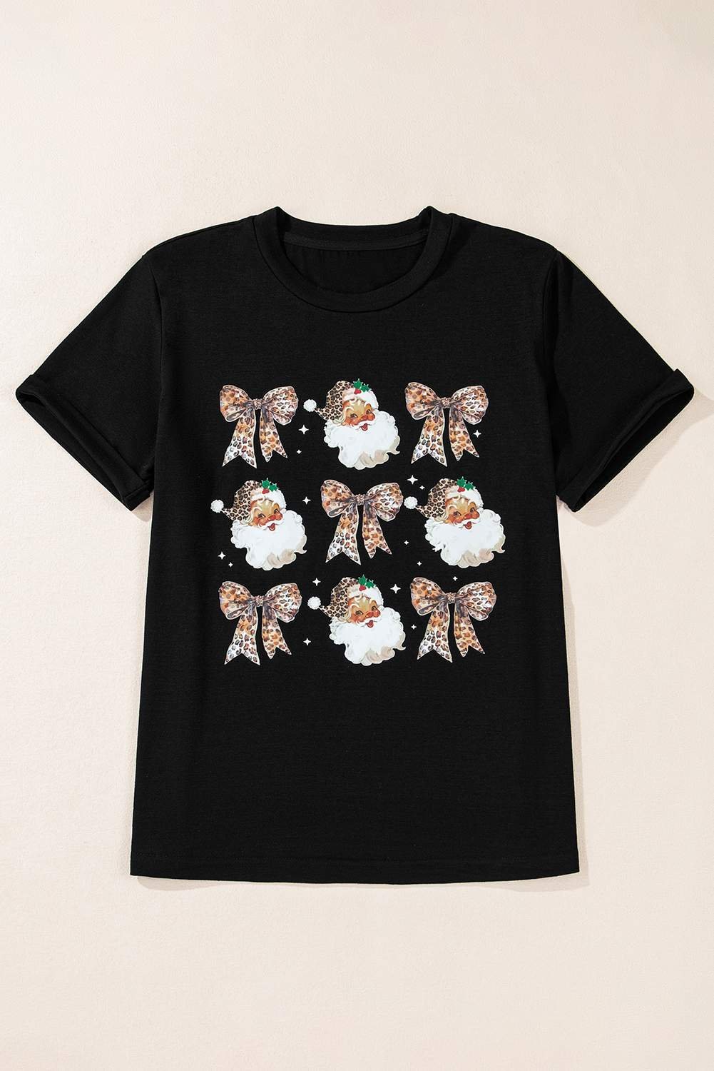 Black Santa Claus Leopard Bow Print Crew Neck Casual T Shirt