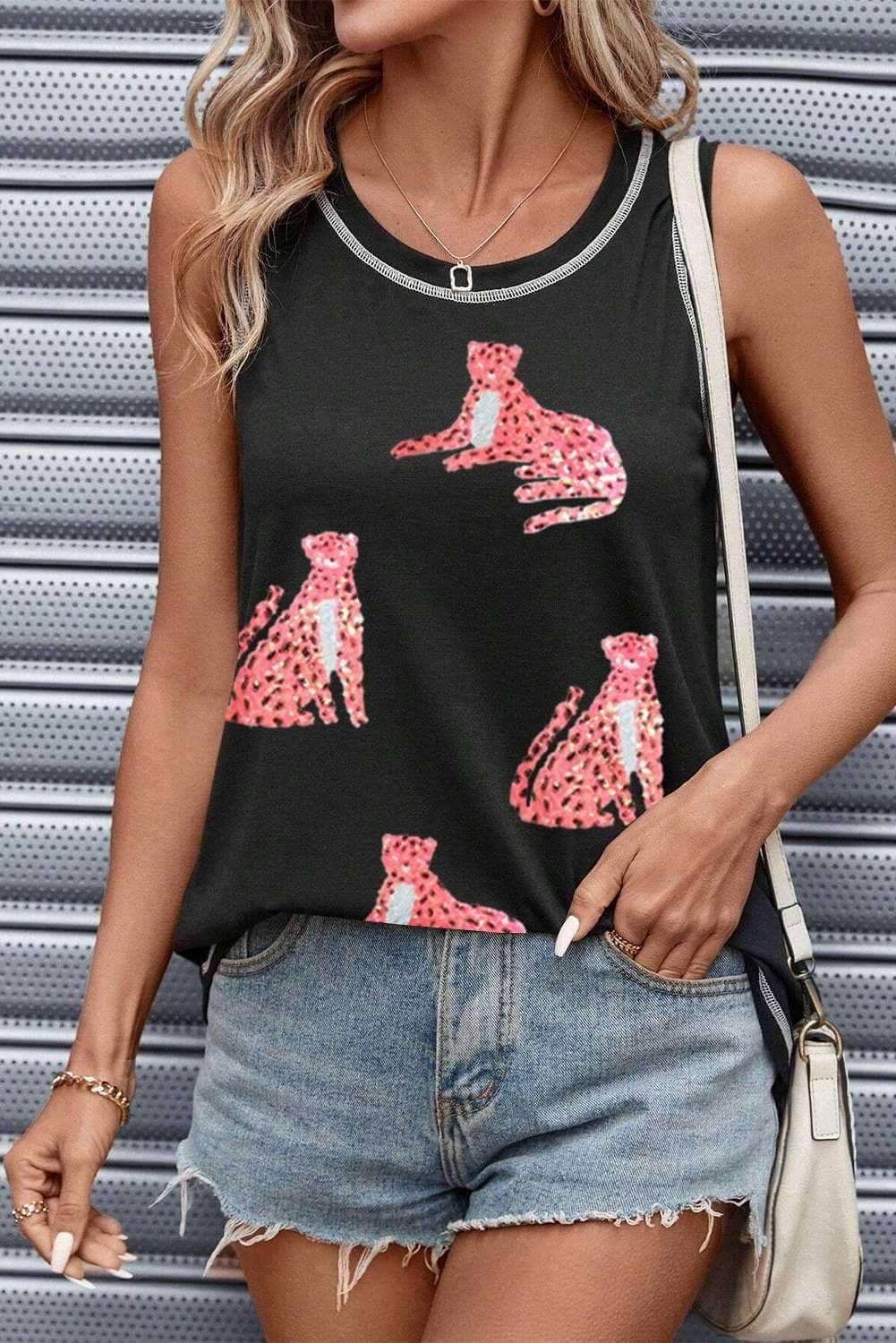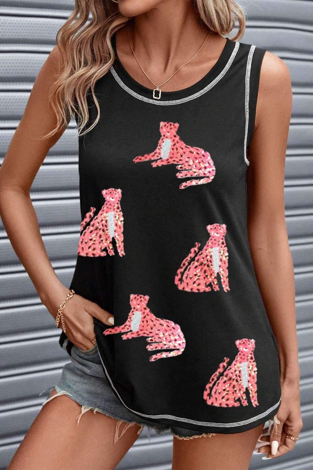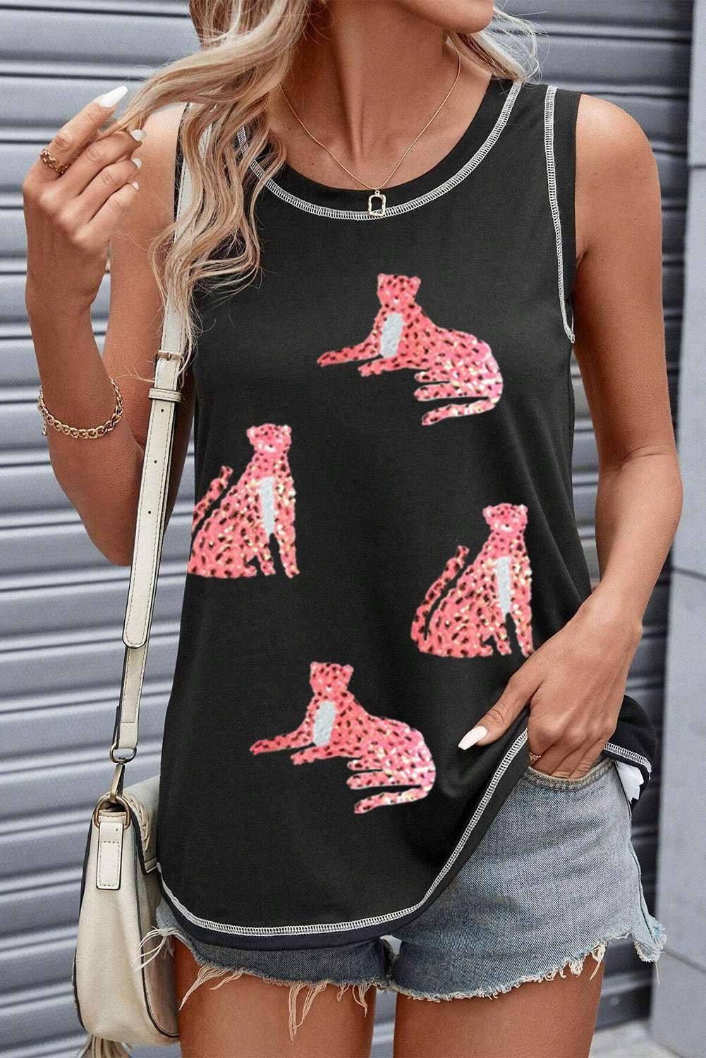 Black Sequin Cheetah Round Neck Stitching Loose Tank Top