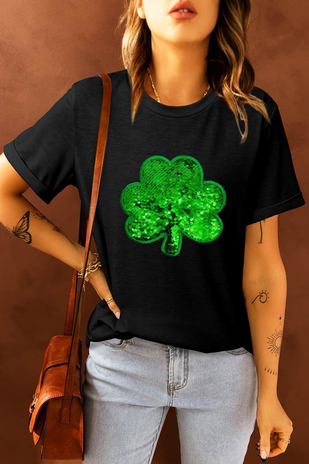 Black Sequin Clover Embroidered Round Neck Graphic Tee
