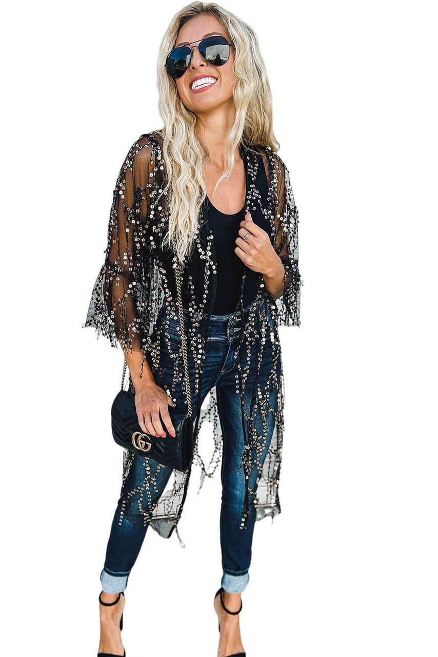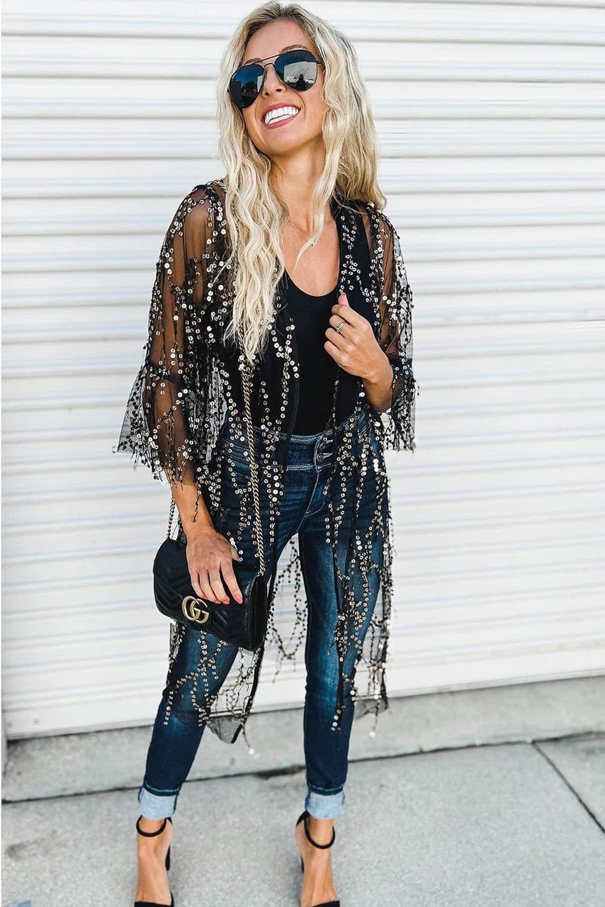 - Textured sequin detailing throughout and cute sleeves for a truly elevated look