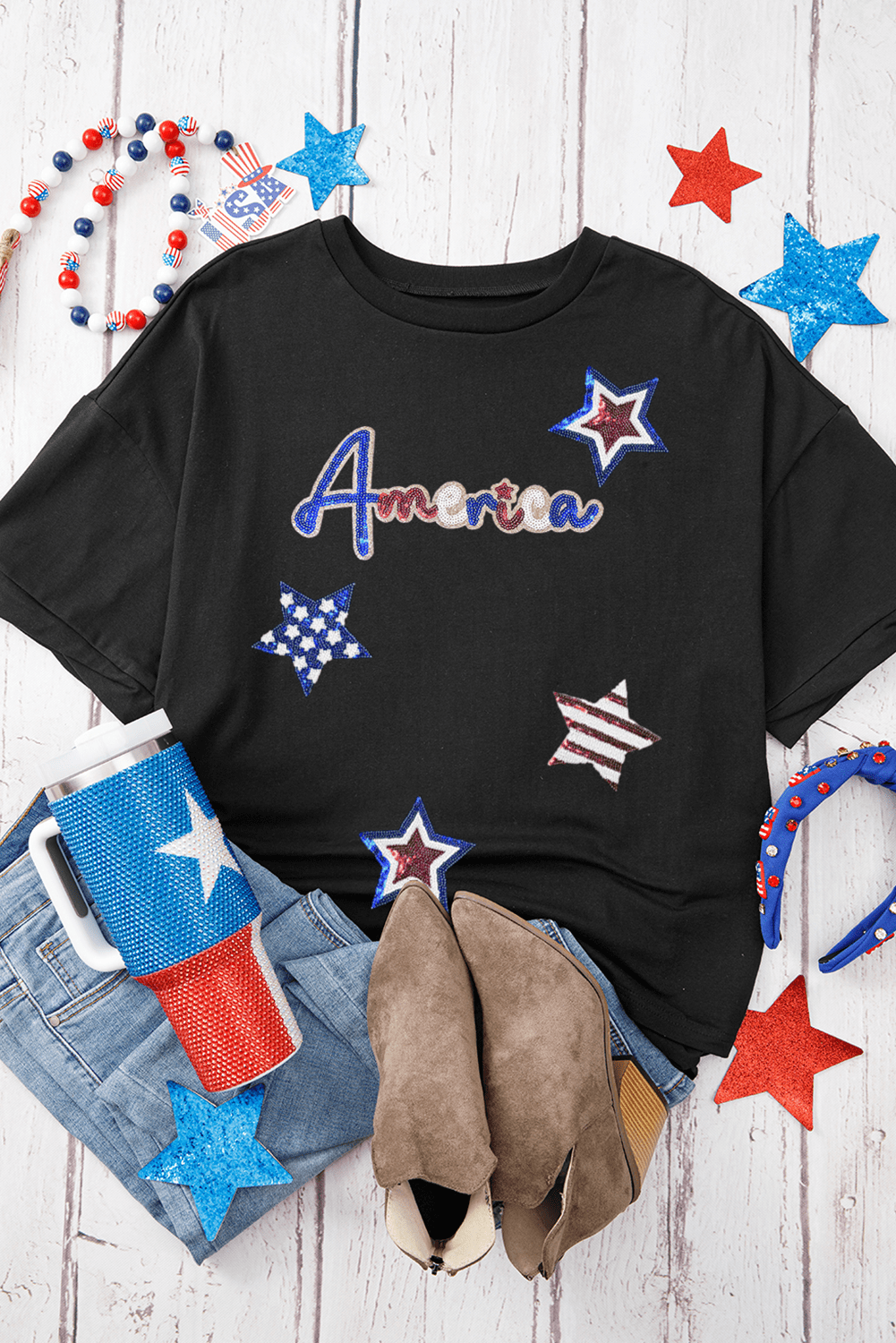 Be the first to review “Black Sequined America Star Pattern Hi Low Hem Casual T Shirt”