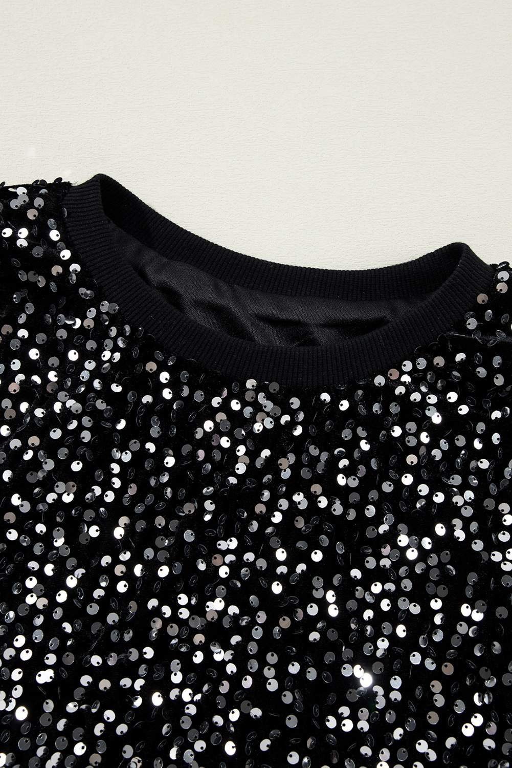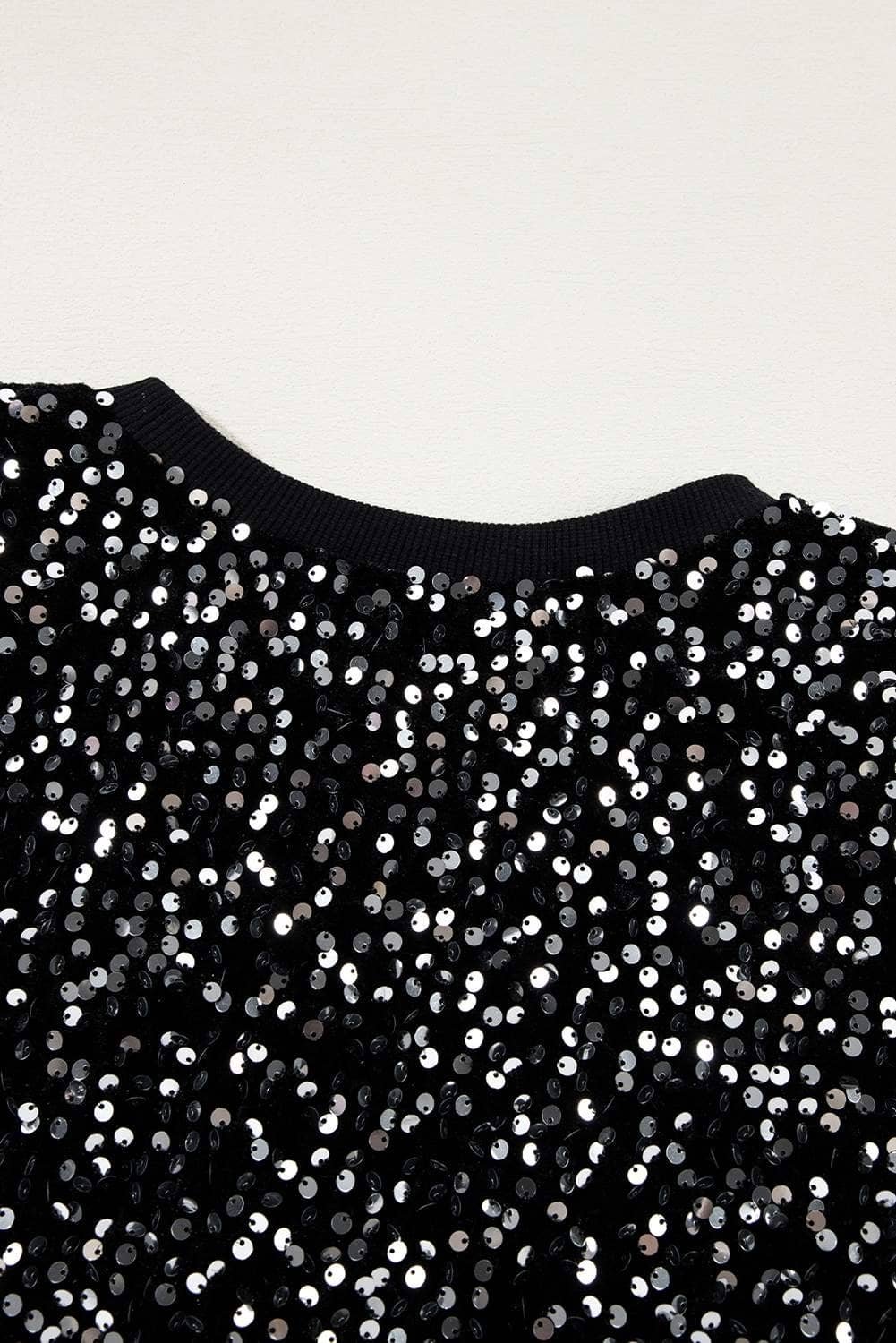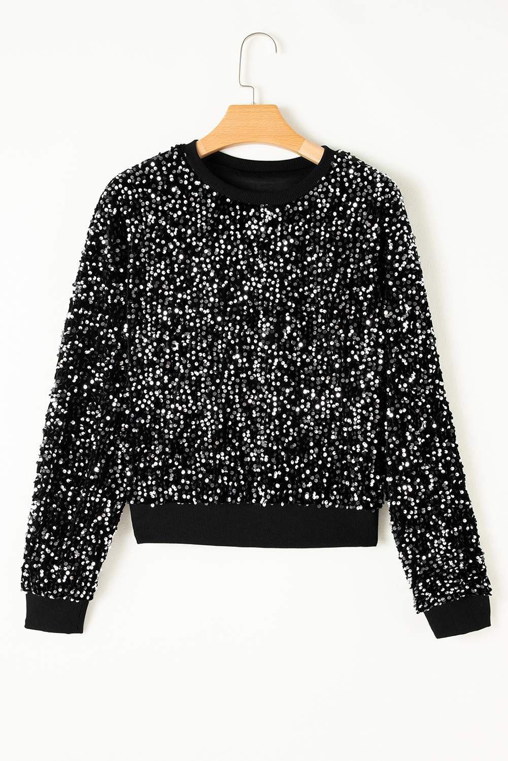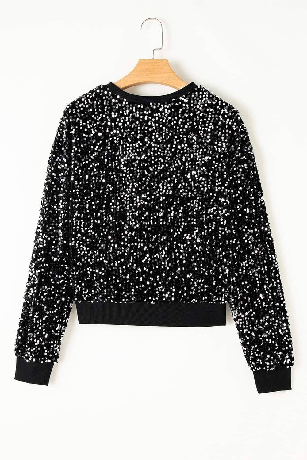 Black Sequined Long Sleeve Crew Neck Cropped Blouse