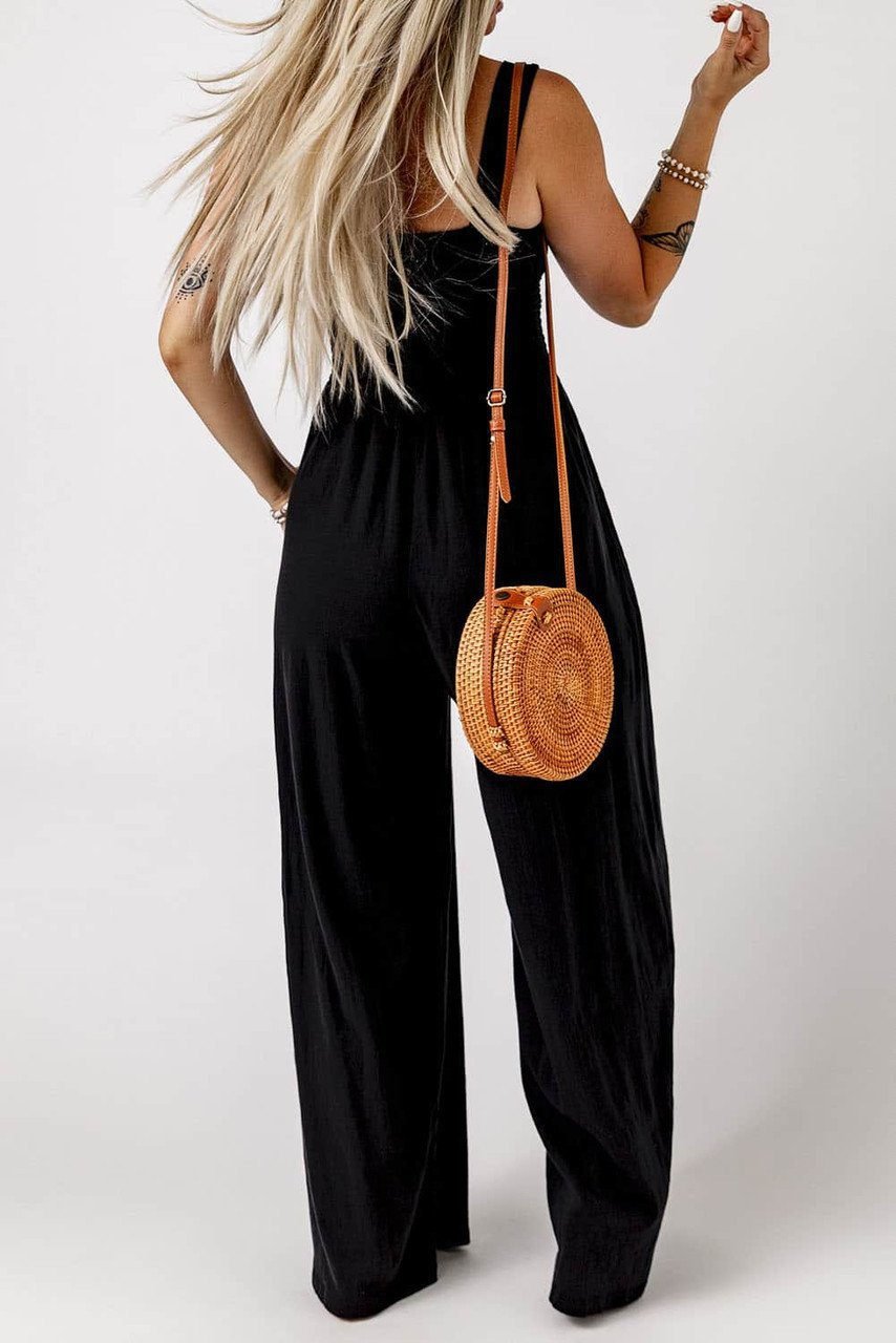 - Featured with a square neckline, sleeveless, ruched waist, wide leg, and side pocket